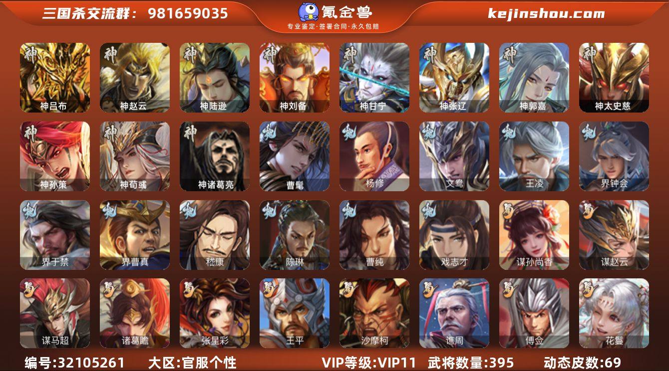 【1315】官阶:大将军;VIP等级:VIP11;史诗武将数量:53;动态皮肤数量:69;武将总数:395;史诗宝珠数量:2;将魂数量:3015;神将:13;魏国史诗武将:26;蜀国史诗武将:11;吴国史诗武将:6;群史诗武将:16 神吕布,神赵云,神陆逊,神刘备,神甘宁,神张辽,神郭嘉,神太史慈,神孙策,神荀彧,神吕蒙,神周瑜,神诸葛亮,曹髦,杨修,文鸯,王凌,魏-司马昭,界钟会,界于禁,界曹真,嵇康,陈琳,曹纯,戏志才,谋孙尚香,谋赵云,谋马超,诸葛瞻,张星彩,王平,沙摩柯,谯周,傅佥,花鬘,谋黄盖,孙寒华,骆统,留赞,界徐盛,贺齐,谋郭嘉,左慈,张让,杨彪,星黄忠,星甘宁,苏飞,麹义,南华老仙,沮授,界左慈,界李儒,李傕,许攸,友徐庶,星董卓,神郭嘉-虎年清明(动态),神郭嘉-倚星折月(动态),神太史慈-勇撼日月(动态),神孙策-霸王再世(动态),神荀彧-虎年清明(动态),神甘宁-战破无间,神甘宁-万人辟易(动态),神诸葛亮-孟章诛邪(动态),神曹操-天下归心,神赵云-战龙在野(动态),星周不疑-才广志宏(动态),钟会-潜蛟觊天(动态),司马懿-牛年立冬(动态),荀彧-驱虎吞狼(动态),王粲-笔翰如流(动态),界司马懿-牛年立冬(动态),张春华-牛年立冬(动态),曹真-虎年春节(动态),戏志才-举棋若定(动态),曹婴-兔年春节(动态),曹纯-虎年春节(动态),司马昭-昭威淮南(动态),星徐晃-斧引霹雳(动态),刘备-龙御天下(动态),刘备-猪年圣诞(动态),关羽-明良千古(动态),马超-明良千古(动态),张飞-明良千古(动态),界刘备-猪年圣诞(动态),SP孙尚香-猪年圣诞(动态),关银屏-兔年春节(动态),李丰-太仓聚粟(动态),卧龙诸葛-火烧博望(动态),太史慈-涤荡江东(动态),周处-义除三害(动态),孙策-虎踞江东(动态),孙权-牛年七夕(动态),界孙权-牛年七夕(动态),徐盛-破军杀将(动态),步练师-牛年七夕(动态),孙茹-烟水悠悠(动态),孙寒华-蛇年限定(动态),周瑜-蛇年端午(动态),文鸯-势若万钧(动态),高顺-每战必克(...