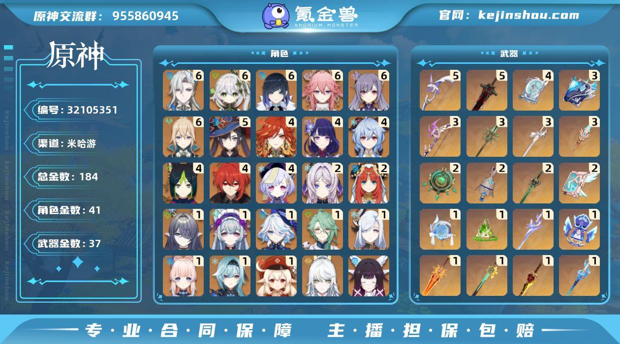 邮箱: 不送邮/死邮 总黄数: 184 冒险等级: 60 6命金色角色: 满命刻晴,满命琴,满命八重神子,满命夜兰,满命纳西妲,满命那维莱特 5命金色角色: 五命莫娜 4命金色角色: 四命迪卢克,四命七七,四命甘雨,四命雷电将军,四命提纳里,四命玛薇卡 2命金色角色: 二命妮露,二命茜特菈莉 1命金色角色: 一命优菈,一命可莉,一命珊瑚宫心海,一命申鹤,一命白术,一命芙宁娜,一命梦见月瑞希,一命菈乌玛 0命金色角色: 温迪,枫原万叶,神里绫华,宵宫,达达利亚,钟离,魈,神里绫人,娜维娅,闲云,阿蕾奇诺,希诺宁,瓦雷莎,爱可菲,丝柯克,奈芙尔,哥伦比娅,兹白 拥有武器: 狼的末路,天空之翼,雾切之回光,飞雷之弦振,四风原典,天空之卷,和璞鸢,阿莫斯之弓,风鹰剑,天空之脊,磐岩结绿,薙草之稻光,不灭月华,终末嗟叹之诗,息灾,赤角石溃杵,神乐之真意,若水,猎人之径,圣显之钥,千夜浮梦,图莱杜拉的回忆,碧落之珑,万世流涌大典,静水流涌之辉,有乐御簾切,岩峰巡歌,焚曜千阳,祭星者之望,苍耀,真语秘匣,帷间夜曲 5精武器: 狼的末路,阿莫斯之弓 4精武器: 四风原典 3精武器: 飞雷之弦振,和璞鸢,风鹰剑,天空之脊,万世流涌大典 2精武器: 天空之卷,磐岩结绿,图莱杜拉的回忆,碧落之珑 1精武器: 狼的末路,天空之翼,雾切之回光,阿莫斯之弓,风鹰剑,磐岩结绿,薙草之稻光,不灭月华,终末嗟叹之诗,赤角石溃杵,息灾,神乐之真意,若水,猎人之径,圣显之钥,千夜浮梦,静水流涌之辉,有乐御簾切,岩峰巡歌,焚曜千阳,祭星者之望,苍耀,真语秘匣,帷间夜曲