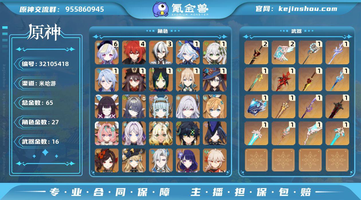 邮箱: 未绑定 总黄数: 65 冒险等级: 60 6命金色角色: 满命七七 4命金色角色: 四命迪卢克 3命金色角色: 三命阿蕾奇诺 1命金色角色: 一命莫娜,一命琴,一命胡桃,一命神里绫人,一命提纳里,一命纳西妲,一命芙宁娜 0命金色角色: 枫原万叶,刻晴,雷电将军,迪希雅,那维莱特,娜维娅,千织,克洛琳德,基尼奇,希诺宁,茜特菈莉,瓦雷莎,爱可菲,丝柯克,伊涅芙,菈乌玛,哥伦比娅 拥有武器: 狼的末路,天空之翼,天空之卷,天空之傲,天空之刃,天空之脊,薙草之稻光,赤角石溃杵,圣显之钥,万世流涌大典,静水流涌之辉,有乐御簾切,赤月之形,岩峰巡歌,苍耀,支离轮光 2精武器: 天空之卷,赤角石溃杵 1精武器: 狼的末路,天空之翼,天空之傲,天空之刃,天空之脊,薙草之稻光,圣显之钥,万世流涌大典,静水流涌之辉,有乐御簾切,赤月之形,岩峰巡歌,苍耀,支离轮光