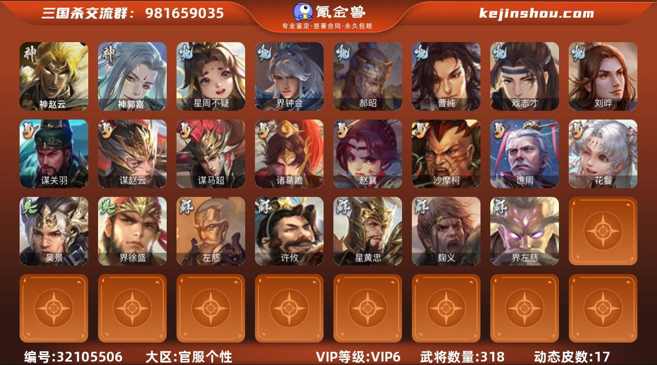 【1354】官阶:骠骑将军;VIP等级:VIP6;史诗武将数量:26;动态皮肤数量:17;武将总数:318;史诗宝珠数量:36;将魂数量:2659;神将:3;魏国史诗武将:6;蜀国史诗武将:8;吴国史诗武将:2;群史诗武将:7 神赵云,神郭嘉,神吕蒙,星周不疑,界钟会,郝昭,曹纯,戏志才,刘晔,谋赵云,谋马超,诸葛瞻,赵襄,沙摩柯,谯周,花鬘,谋关羽,吴景,界徐盛,左慈,星黄忠,麹义,界左慈,张绣,李傕,许攸,神太史慈-勇撼日月(动态),神吕蒙-心生万象,钟会-龙年端午(动态),SP蔡文姬-兔年冬日(动态),曹纯-虎年春节(动态),关索-依心缱绻(动态),关羽-明良千古(动态),黄月英-鼠年春节(动态),界黄月英-鼠年春节(动态),周处-义除三害(动态),孙权-猪年端午(动态),界孙权-猪年端午(动态),徐盛-破军杀将(动态),吕布-鼠年七夕(动态),界吕布-鼠年七夕(动态)