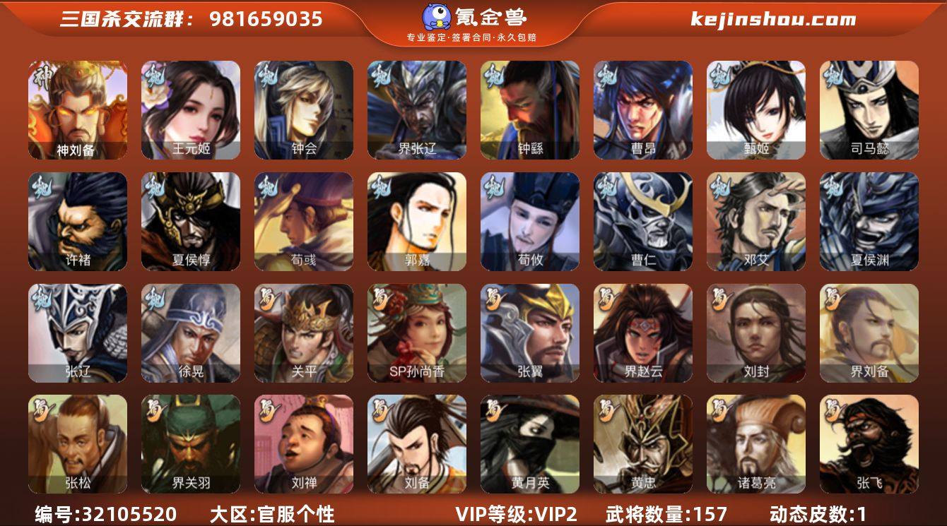 官阶: 先锋将军 VIP等级: VIP2 武将数量: 157 动态皮肤数量: 1 神将: 神刘备 魏国武将: 王元姬,张辽,曹昂,曹仁,荀攸,钟繇,郭嘉,荀彧,夏侯惇,许褚,界张辽,钟会,司马懿,甄姬,徐晃,夏侯渊,邓艾 蜀国武将: 界关羽,张松,界刘备,刘封,黄月英,关羽,张飞,刘禅,界赵云,张翼,SP孙尚香,诸葛亮,关平,庞统,黄忠,刘备 吴国武将: 界朱然,吕蒙,诸葛恪,孙尚香,陆逊,界黄盖,孙权,谋小乔,界甘宁,甘宁,孙坚,周瑜,小乔,黄盖,势太史慈 群国武将: 沮授,刘协,吕布,SP赵云,张角,貂蝉,颜良文丑,贾充,势田丰,SP于禁
