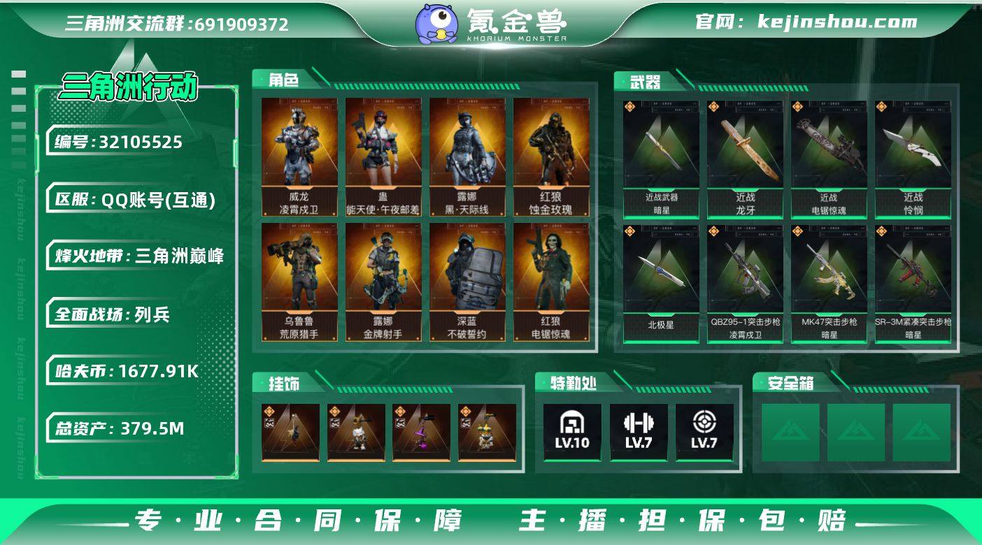 实名:不可二次实名 总资产:379.5M 哈夫币:1677.91K 烽火地带段位:三角洲巅峰 烽火地带等级:60 全面战场段位:列兵 全面战场等级:18 10级仓库,7级训练中心,7级靶场,6级指挥中心,3级潜水中心,3级防具台,3级工作台,3级制药台,3级技术中心,2级收藏室 战术部门等级:4 战斗部门等级:4 医疗部门等级:4 研发部门等级:4 后勤部门等级:4 曼德尔砖-气象感应:0 曼德尔砖-命运王牌:0 曼德尔砖-电玩高手:0 曼德尔砖-美杜莎:1