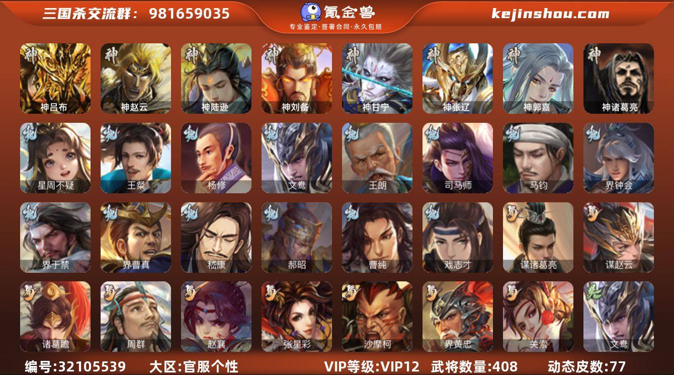 【1360】官阶:大将军;VIP等级:VIP12;史诗武将数量:59;动态皮肤数量:77;武将总数:408;史诗宝珠数量:0;将魂数量:2602;神将:10;魏国史诗武将:33;蜀国史诗武将:9;吴国史诗武将:6;群史诗武将:23 神吕布,神赵云,神陆逊,神刘备,神甘宁,神张辽,神郭嘉,神吕蒙,神周瑜,神诸葛亮,星周不疑,王粲,杨修,文鸯,王朗,司马师,马钧,界钟会,界于禁,界曹真,嵇康,郝昭,曹纯,戏志才,关索,谋诸葛亮,谋赵云,诸葛瞻,周群,赵襄,张星彩,沙摩柯,界黄忠,骆统,留赞,界朱然,界徐盛,界步练师,贺齐,谋貂蝉,裴秀,张让,杨彪,徐荣,星甘宁,陶谦,苏飞,司马徽,麹义,南华老仙,祢衡,刘璋,刘焉,沮授,界左慈,界李儒,公孙康,杜预,卑弥呼,张绣,李傕,许攸,神郭嘉-虎年清明(动态),神甘宁-万人辟易(动态),神陆逊-绽焰摧枯(动态),神诸葛亮-风舞魔鸟(动态),神周瑜-焰腾麒麟(动态),神曹操-天下归心,神吕布-冠绝天下(动态),神赵云-战龙在野(动态),钟会-潜蛟觊天(动态),曹丕-气荡山河(动态),曹丕-龙年中秋(动态),许褚-虎啸生风(动态),甄姬-牛年清明(动态),曹丕-牛年清明(动态),界许褚-虎啸生风(动态),界甄姬-牛年清明(动态),界曹丕-牛年清明(动态),于禁-威严毅重(动态),张春华-牛年立冬(动态),钟繇-稳定关右(动态),界于禁-威严毅重(动态),戏志才-举棋若定(动态),朱灵-以战破氐(动态),曹纯-长坂败备(动态),清河公主-魅影萦心(动态),刘备-龙御天下(动态),诸葛亮-龙年限定(动态),马超-牛年春节(动态),赵云-牛年春节(动态),界赵云-牛年春节(动态),界马超-牛年春节(动态),关索-鼠年中秋(动态),周处-义除三害(动态),孙权-永开吴祚(动态),周瑜-兔年七夕(动态),孙策-虎踞江东(动态),孙权-吴王六剑(动态),孙尚香-星流霆击(动态),大乔-猪年七夕(动态),界大乔-猪年七夕(动态),界孙权-吴王六剑(动态),界孙尚香-星流霆击(动态),徐盛-破军杀将(动态),孙鲁班-牛年端午(动态)...