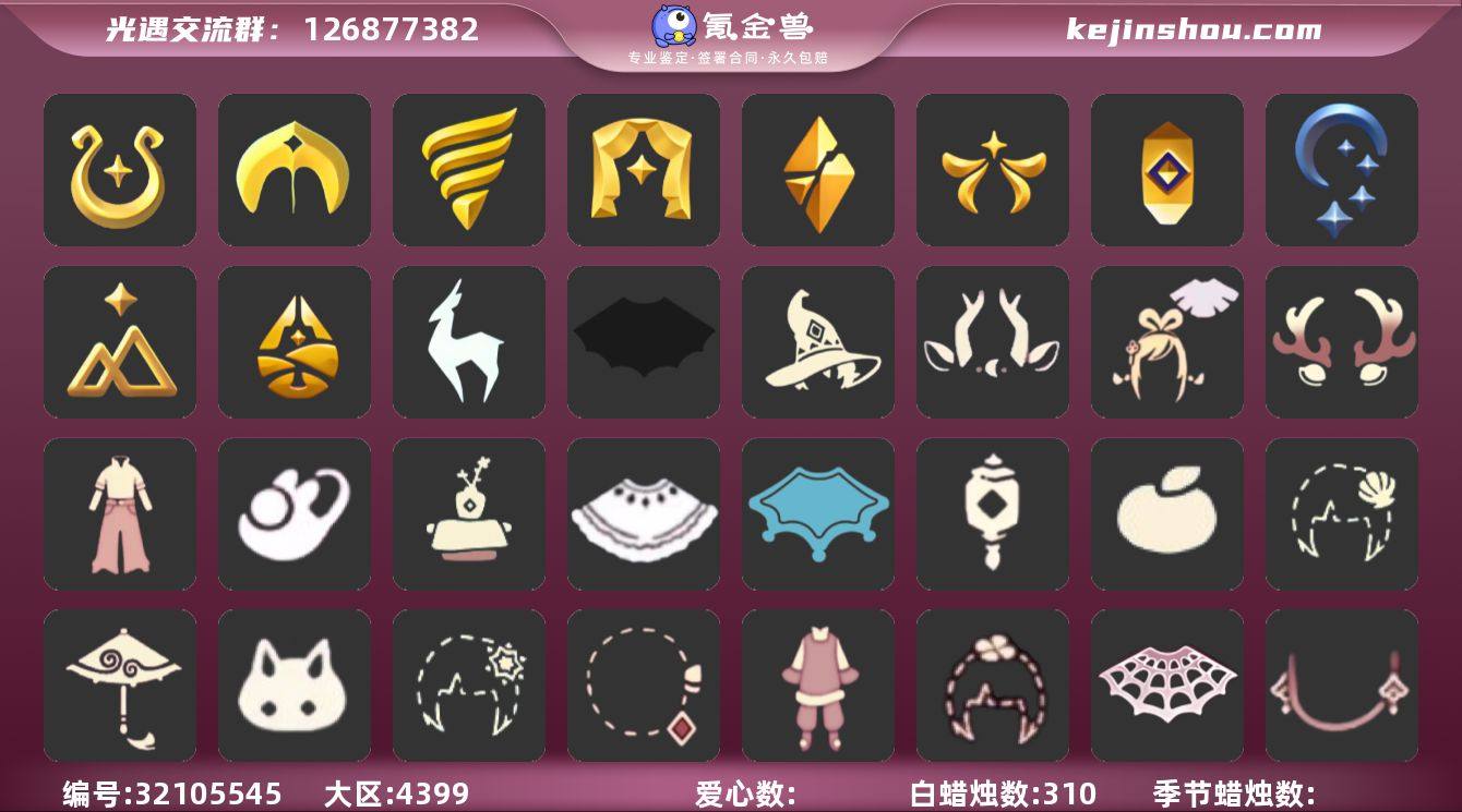 VIVO 手机账号 5珍稀物品 12毕业季 6毕业图 310蜡烛 【珍稀物品】魔法季耳坠(双边耳坠)(魔法耳坠),白枭(帝企鹅发),透明蝶翼斗,彩虹围巾(五塑彩带斗),鳐鲲斗篷 【季节已毕业】迁徙季,魔法季,圣岛季,潜海季,表演季,破晓季,欧若拉季(欧若拉),追忆季,夜行季,拾光季,归巢季,九色鹿(九色鹿季) 【完成地图】晨岛,云野,雨林,霞谷,墓土(暮土),禁阁 【礼包】牛仔裤(阔腿牛仔),兔子鞋(兔子拖鞋),新年裤(瑞气服饰),巫师(巫师帽),绊爱(绊爱斗篷)(绊爱礼包),橘子(大橘大利),雪花(雪花发夹),贝壳(贝壳发饰),兔子(玉兔头饰)(玉兔发饰)(兔子发饰),四叶草(四叶草头饰),九色鹿角(神鹿祝福头饰)(神鹿祝福礼包),新年耳钉(金鳞耳饰),彩虹耳钉(彩虹耳饰),日光耳环,鹿角(圣诞鹿角),创始人(创始人斗篷),蝙蝠套(蝙蝠斗篷)(南瓜头),透明蛛丝(透明蜘蛛斗),瑞雪(瑞雪斗篷)(暖冬瑞雪),白绒金(白雪斗篷),红伞(瑞气纸伞),灯笼(中秋灯笼),茶桌(花憩茶桌) 【裤子】飞天裤(柔缎花边连)(九色鹿丝带裤),蓝绿裤(高领舞服),武士裤,背带裤,搓澡巾 【面具】黄眉企鹅面具,夜行毕业面具(棕熊面具),呼吸面具(潜水面具) 【面饰】黑框眼镜(粗框眼镜),红耳机 【项链】围巾(肩带) 【发型】单侧绑发(单边小辫),留辫蘑菇头,飞天盘发(九色鹿丸子头),虚荣,归巢毕业发型(五塑彩羽发),若笠(箬笠) 【头饰】平顶帽,蓝色音乐会(蓝色音乐符),牛仔帽(西部帽) 【斗篷】冥龙斗篷,燕尾斗篷,遥鲲斗篷(双翼遥鲲斗),粉红绒毛斗篷(绒毛斗篷),绿芽,海洋斗 【配饰】鲲灯(追忆之书),蓝色手碟(毕业手碟),相机(季卡相机),雨伞,高音钢琴(白色高脚钢琴)