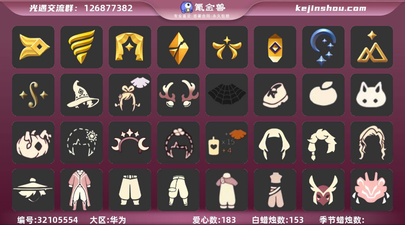 账号类型: 手机账号 季节已毕业: 风行季,潜海季,表演季,破晓季,欧若拉季,夜行季,追忆季,拾光季,二重奏季 完成地图: 晨岛,雨林,霞谷,暮土 珍稀物品: 白枭,透明蝶翼斗 礼包: 巫师,绊爱,鹿角,蜘蛛斗,运动鞋,橘子,兔子,南瓜,雪花,星月头饰,四叶草,创始人 裤子: 武士裤,背带裤,搓澡巾,蓝绿裤,青鸟尊贵蓬头裤子 面具: 呼吸面具,夜行毕业面具,黄眉企鹅面具 面饰: 红耳机,黑框眼镜 项链: 围巾 发型: 若笠,虚荣,单侧绑发,留辫蘑菇头 头饰: 羽毛发饰,牛仔帽,蓝色音乐会,平顶帽 斗篷: 海洋斗,绿芽,粉红绒毛斗篷,遥鲲斗篷,燕尾斗篷,冥龙斗篷 配饰: 雨伞,高音钢琴,姆明抱枕,小红伞,相机,二重奏挂画,鲲灯 亮点: 【优质装备】:表演季,白枭(帝企鹅发),武士裤,青鸟尊贵蓬头裤子(蓝色燕尾服),风行季,潜海季,破晓季,透明蝶翼斗,欧若拉季(欧若拉),羽毛发饰(多羽发饰),高音钢琴(白色高脚钢琴),夜行季,追忆季,牛仔帽(西部帽),姆明抱枕,小红伞(姆明红伞)(姆明大伞),相机(季卡相机),拾光季,蓝绿裤(高领舞服),围巾(肩带),二重奏挂画(合奏挂画),夜行毕业面具(棕熊面具),黑框眼镜(粗框眼镜),留辫蘑菇头,遥鲲斗篷(双翼遥鲲斗),冥龙斗篷,绊爱(绊爱斗篷)(绊爱礼包),红耳机,鹿角(圣诞鹿角),蜘蛛斗(蛛丝斗篷)(蛛网斗篷),巫师(巫师帽),晨岛,雨林,霞谷,墓土(暮土),若笠(箬笠),二重奏季,呼吸面具(潜水面具),黄眉企鹅面具,单侧绑发(单边小辫),粉红绒毛斗篷(绒毛斗篷),燕尾斗篷,鲲灯(追忆之书),运动鞋(跃动跑鞋),星月头饰(星月头冠),创始人(创始人斗篷),兔子(玉兔头饰)(玉兔发饰)(兔子发饰),南瓜(冥龙南瓜),雪花(雪花发夹),橘子(大橘大利),四叶草(四叶草头饰)