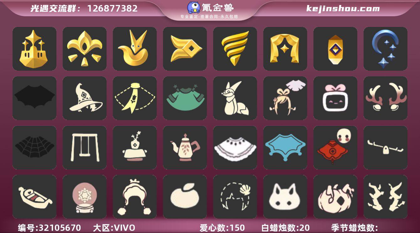 账号类型: 手机账号 季节已毕业: 梦想季,小王子季,风行季,潜海季,表演季,集结季,夜行季,追忆季 完成地图: 晨岛,云野,雨林,霞谷,暮土,禁阁 珍稀物品: 白枭,玫瑰花 礼包: 蝙蝠套,巫师,围巾,星球斗,小狐狸,绊爱,大铁头,鹿角,蜘蛛斗,秋千,茶桌,茶壶,白绒金,瑞雪,福娃,跷跷板,小船,雪花球,绒帽,橘子,贝壳,兔子,南瓜,枯角,雪花,彩虹耳钉,蝴蝶结,四叶草,创始人 裤子: 武士裤,背带裤,搓澡巾,击剑裤,王子服 面具: 凤凰面具,贴花面具,呼吸面具,夜行毕业面具,黄眉企鹅面具 面饰: 红耳机,黑框眼镜 项链: 围巾 发型: 若笠,虚荣,单侧绑发,小王子发型 头饰: 行军锅头盔,羽毛发饰,蓝色音乐会,平顶帽 斗篷: 海洋斗,蟑螂斗,绿芽,粉红绒毛斗篷,黄色连帽披风,燕尾斗篷 配饰: 雨伞,高音钢琴,玫瑰花,鲲灯 亮点: 【优质装备】:表演季,白枭(帝企鹅发),武士裤,梦想季,小王子季(王子季),风行季,潜海季,行军锅头盔(六边锅帽子)(双耳锅帽子),羽毛发饰(多羽发饰),高音钢琴(白色高脚钢琴),集结季,玫瑰花,夜行季,追忆季,王子服(小王子套装),蟑螂斗(凤凰斗篷),围巾(肩带),蝙蝠套(蝙蝠斗篷)(南瓜头),星球斗(星球夹克),绊爱(绊爱斗篷)(绊爱礼包),红耳机,围巾(小王子斗篷)(小王子围巾),大铁头,鹿角(圣诞鹿角),巫师(巫师帽),小狐狸(狐狸背包),晨岛,云野,雨林,霞谷,墓土(暮土),禁阁,若笠(箬笠),凤凰面具,贴花面具(丛林黑面具),呼吸面具(潜水面具),夜行毕业面具(棕熊面具),黄眉企鹅面具,黑框眼镜(粗框眼镜),单侧绑发(单边小辫),小王子发型,粉红绒毛斗篷(绒毛斗篷),黄色连帽披风(连帽斗篷)(斜边队长斗篷),燕尾斗篷,鲲灯(追忆之书),福娃(福娃礼包)(春之日礼包)(铜钱斗),秋千(情人秋千),茶桌(花憩茶桌),茶壶(小憩茶桌),跷跷板(情人跷跷板),小船(情人小船),蜘蛛斗(蛛丝斗篷)(蛛网斗篷),瑞雪(瑞雪斗篷)(暖冬瑞雪),白绒金(白雪斗篷),雪花球(雪花水晶球),绒帽(温...
