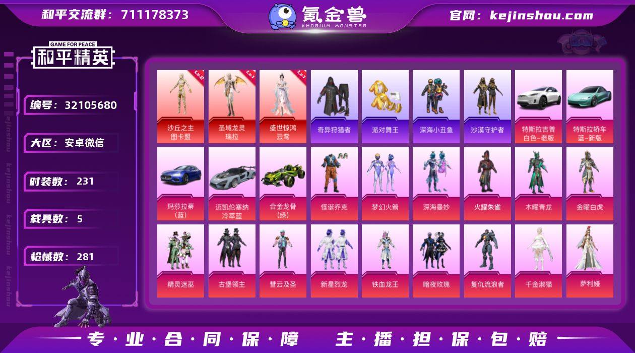 YZJ13802 不可二次 安卓V-3红装3稀有5载具16粉装12特效枪36热门231套装281枪皮 108544热力值 极品红装身法素材号 4款九级升级枪 3款升级飞行器 图卡盟 瑞拉 云鸾 小丑 火箭少女 金鞋 黑丝 奇异狩猎者 红眼罩 晶辉眼罩 奇迹天团 浪漫波比 软萌银虎 深海小丑鱼 NV战队服 裁决冥王 千金淑猫 小白龙 熊二 粉熊包 蓝玛莎 合金龙骨 粉雪蛇宝伙伴 3级P90沙丘之主 M24境域双华 98K圣域龙灵 Mk14盛世惊鸿 满级M4五爪 6级斯嘎梦幻火箭 6级M762激战未来 21印记 历史绝世王牌20星 【3红装】 圣域龙灵-瑞拉 (1级) 盛世惊鸿-云鸾 (1级) 沙丘之主-图卡盟 (2级) 【3稀有】 奇异狩猎者 派对舞王 派对舞王(金靴子) 【5载具】 玛莎拉蒂蓝色 迈凯伦塞纳(冷萃蓝) 特斯拉R水滴蓝 合金龙骨绿色 特斯拉X白色 【16粉装】 梦幻火箭 萨利娅 千金淑猫 深海曼妙 火曜朱雀 木曜青龙 金曜白虎 怪诞乔克 幻海仙踪 精灵迷巫 古堡领主 彗云及圣 新星烈龙 铁血龙王 暗夜玫瑰 复仇流浪者 【12特效枪】 SCAR-L-梦幻火箭 (6级) M416-五爪金龙 (7级) P90-沙丘之主 (3级) Kar98K-圣域龙灵 (2级) Kar98K-巳巳如意 (5级) DP-28-豹影疾电 (5级) AUG-暖羊咩咩 (5级) UMP45-量子极限 (5级) Mk14-盛世惊鸿 (3级) M24-镜域双华 (1级) GROZA-镜光银凌 (5级) M762-激战未来 (6级) 【36热门】 奇迹天团 雪山精英 晶辉守护 暗夜武装 软萌银虎 蔷薇魔法师 奇迹天团 沙漠守护者 深海小丑鱼 大橘为重 浪漫波比 NV战队服 裁决冥王 暗影哥特 迪迦奥特曼 赛罗奥特曼 团圆交子 青龙圣者 机械英豪 破蛋小黄鸡 风华少年志 白月香洋装 新侠客行 军刀雅典娜 英勇保护者 不夜海上花 Kar98K-终极赛罗 M416-仓鼠灰灰 AKM-奇异狩猎者 M762-奇异狩猎者 M762-瑞龙福将 M24-奇异狩猎者 S686-奇异狩猎者 AUG-魔法学院 M24-香水柠檬 Mini14-林间仙鹿 【4飞行器】 龙翔九天飞行器 梦幻火箭...