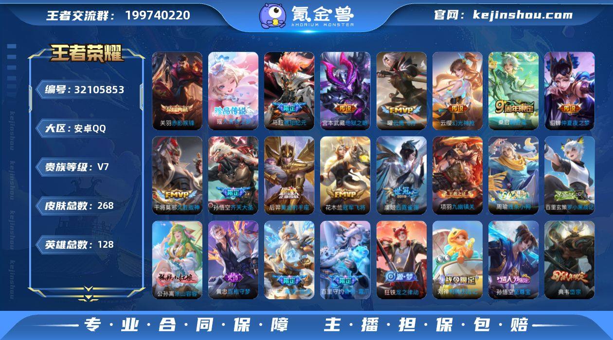 实名: 可修改 性别: 男号 贵族等级: V7 英雄数: 128 皮肤数: 268 荣耀水晶: 赤影疾锋 珍品传说: 大耳狗之梦 传说皮: 黄金射手座,冠军飞将,云鹰飞将,久胜战神,云霓雀翎,仲夏夜之梦,地狱之眼,琥珀纪元马超,幻光神枪 限定皮: 李小龙,岱宗,至尊宝,高山流水,猪悟能,五谷丰年,齐天大圣,鸣野蒿,逐霄战戟 亮点: 【优质装备】:赤影疾锋,大耳狗之梦,黄金射手座,冠军飞将,云鹰飞将(小将军),久胜战神,云霓雀翎,仲夏夜之梦(大飞蛾),地狱之眼,琥珀纪元马超,涂山容容