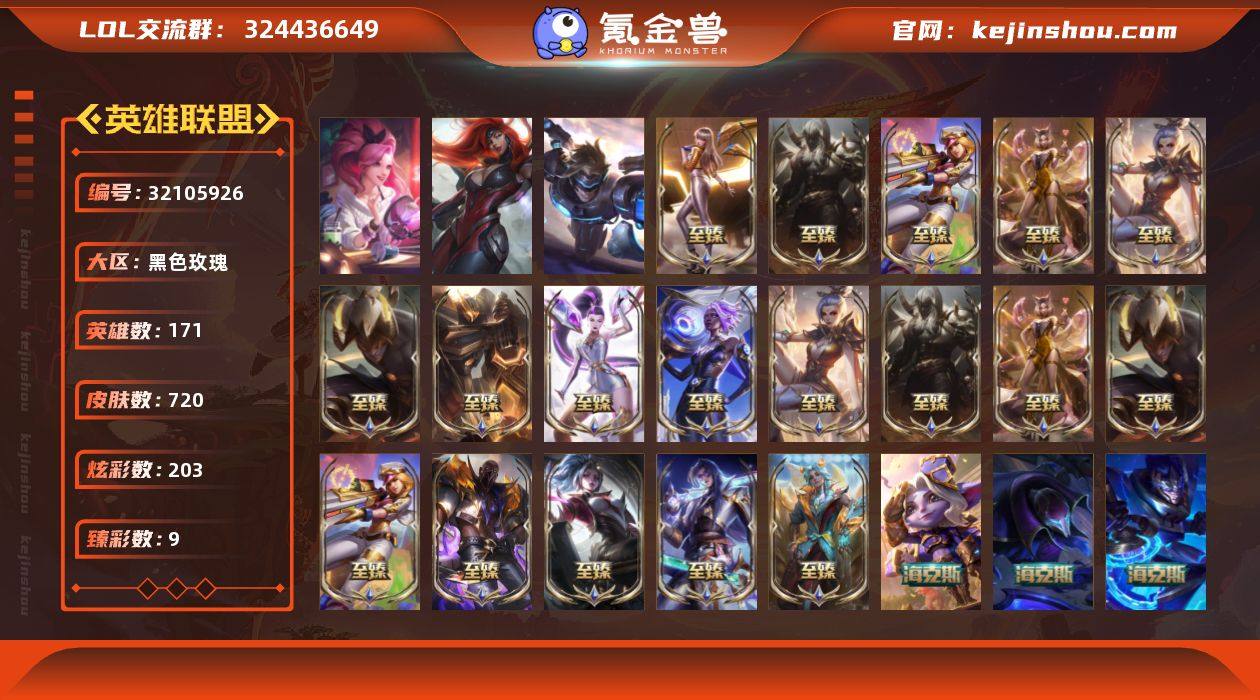 【特价出售/店主推荐】铂金段位-171英雄-720皮肤-203炫彩-5终极-30神话-116限定-71传说-162史诗 【至臻皮肤】:至臻电玩女神凯特琳,至臻电玩女神凯特琳(2022),至臻黑夜使者李青,至臻黑夜使者李青(2022),至臻天龙之子伊泽瑞尔,至臻魔女阿卡丽,至臻王国机神玄武盖伦,至臻玉剑传说武剑仙锐雯,至臻玉剑传说武剑仙(2022),至臻KDA阿狸,至臻KDA阿狸(2022),至臻KDA卡莎,至臻KDAALLOUT卡莎,至臻月蚀骑士赛娜,至臻腥红之月亚托克斯,至臻腥红之月亚托克斯(2022),至臻斗魂觉醒派克,至臻心之钢永恩 【臻彩皮肤】:无畏骑士瑟庄妮赤子初心,吕布奉先炫金战神,张辽文远炫金将军,南天之怒沃里克炫金天神,冠军之刃锐雯2016凯旋圣装,冠军之矛卡莉丝塔凯旋圣装,雾雨之刃锐雯,西部天使赛娜神选天使长,幻灵战斗蝠薇恩梦幻强袭 【年限皮肤】:古琴余韵娑娜,定海神珍孙悟空,神龙之翼库奇,广寒仙子嫦娥,美猴王孙悟空,玉净夜叉凯特琳,张辽文远,司马懿仲达,虎痴之拳蔚,南天之怒沃里克,北辰之威内瑟斯,金猪烈焰瑟庄妮,烈焰美人薇恩,王国机神青龙德莱文,福牛守护者嘉文四世,天龙之子斯莫德 【海克斯皮肤】:海克斯科技崔丝塔娜,海克斯科技魔腾,海克斯科技雷克顿,海克斯科技嘉文四世,摄魂使者薇恩,海克斯科技波比,海克斯科技玛尔扎哈 【情人节限定】:甜心宝贝安妮,甜心宝贝娑娜,觅心萝莉金克丝,觅心猎手薇恩,觅心游侠卢锡安 【冰雪限定】:幸福女神乐芙兰,圣诞精灵崔丝塔娜,圣诞狂欢努努和威朗普,圣诞狂欢基兰,阿木木“主人不要我了”,胡桃夹子萨科,平安夜女神娑娜,冬季仙境卡尔玛,邪恶圣诞老人维迦,夺命美人卡特琳娜,喜庆之树茂凯,雪默丁格,圣诞驯鹿克格莫,魄罗骑士瑟庄妮,圣诞老人布隆,冰雪节辛吉德,冰雪节格雷福斯,冰雪兽纳尔 【终极皮肤】:KDAALLOUT萨勒芬妮独立音乐人...