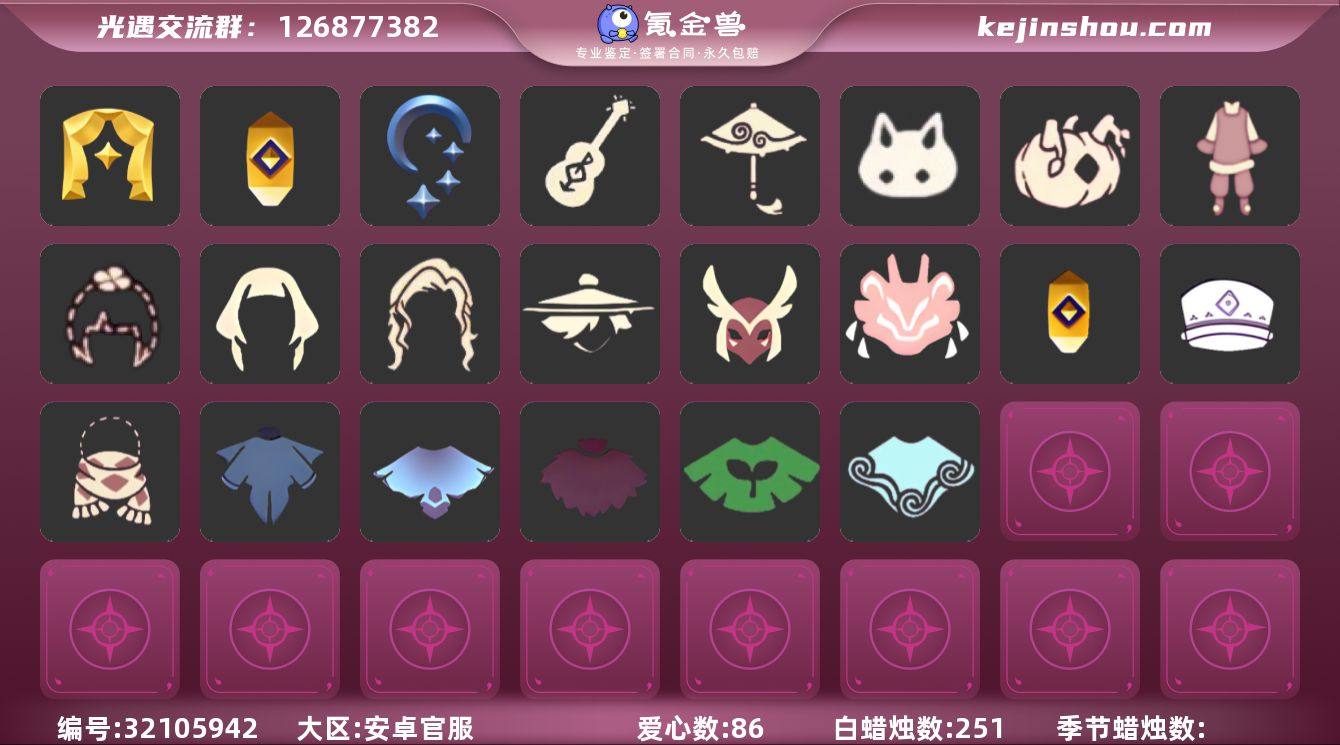 账号类型: 邮箱账号 季节已毕业: 表演季,夜行季,追忆季 珍稀物品: 白枭 礼包: 吉他,红伞,兔子,南瓜,新年裤,四叶草 面具: 夜行毕业面具,黄眉企鹅面具 项链: 围巾 发型: 若笠,虚荣,留辫蘑菇头 头饰: 平顶帽 斗篷: 海洋斗,绿芽,粉红绒毛斗篷,遥鲲斗篷,燕尾斗篷 配饰: 鲲灯 亮点: 【优质装备】:表演季,白枭(帝企鹅发),若笠(箬笠),夜行季,追忆季,围巾(肩带),夜行毕业面具(棕熊面具),黄眉企鹅面具,留辫蘑菇头,粉红绒毛斗篷(绒毛斗篷),遥鲲斗篷(双翼遥鲲斗),燕尾斗篷,鲲灯(追忆之书),吉他(音韵吉他)(白吉他),红伞(瑞气纸伞),新年裤(瑞气服饰),兔子(玉兔头饰)(玉兔发饰)(兔子发饰),南瓜(冥龙南瓜),四叶草(四叶草头饰)