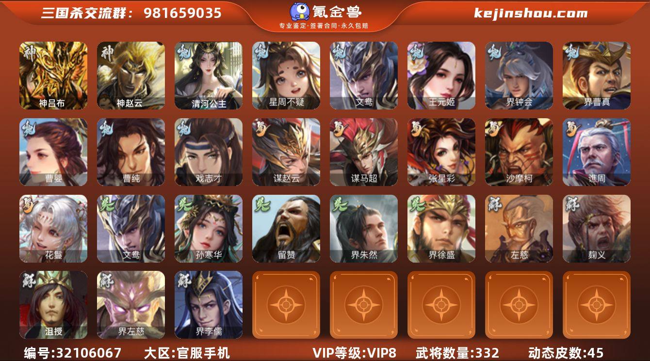 【1408】官阶:大将军;VIP等级:VIP8;史诗武将数量:28;动态皮肤数量:45;武将总数:332;史诗宝珠数量:0;将魂数量:4735;神将:3;魏国史诗武将:28;蜀国史诗武将:6;吴国史诗武将:4;群史诗武将:8 神吕布,神赵云,神周瑜,星周不疑,文鸯,王元姬,界钟会,界曹真,曹婴,曹纯,戏志才,清河公主,谋赵云,谋马超,张星彩,沙摩柯,谯周,花鬘,孙寒华,留赞,界朱然,界徐盛,谋郭嘉,左慈,麹义,沮授,界左慈,界李儒,鲍信,阎象,星周不疑-才广志宏(动态),曹丕-气荡山河(动态),甄姬-明珠耀躯(动态),SP蔡文姬-兔年冬日(动态),曹丕-猪年端午(动态),曹昂-竭战麟伤(动态),戏志才-举棋若定(动态),曹婴-兔年春节(动态),曹纯-虎年春节(动态),王元姬-鼠年冬至(动态),司马昭-昭威淮南(动态),张辽-龙生九子(动态),星徐晃-斧引霹雳(动态),清河公主-魅影萦心(动态),夏侯氏-明良千古(动态),关银屏-鼠年中秋(动态),孙茹-龙年七夕(动态),周处-义除三害(动态),吕蒙-剑起惊澜(动态),孙权-永开吴祚(动态),孙策-虎踞江东(动态),孙寒华-莲华熠熠(动态),孙寒华-威灵尽显(动态),孙权-牛年七夕(动态),孙尚香-兔年春节(动态),界孙权-牛年七夕(动态),徐盛-破军杀将(动态),孙鲁班-牛年端午(动态),界孙鲁班-牛年端午(动态),刘赞-灵魂歌王(动态),袁绍-声震寰宇(动态),麹义-扬刀立威(动态),李儒-鸠杀少帝(动态),界李儒-鸠杀少帝(动态),左慈-蛇年限定(动态)