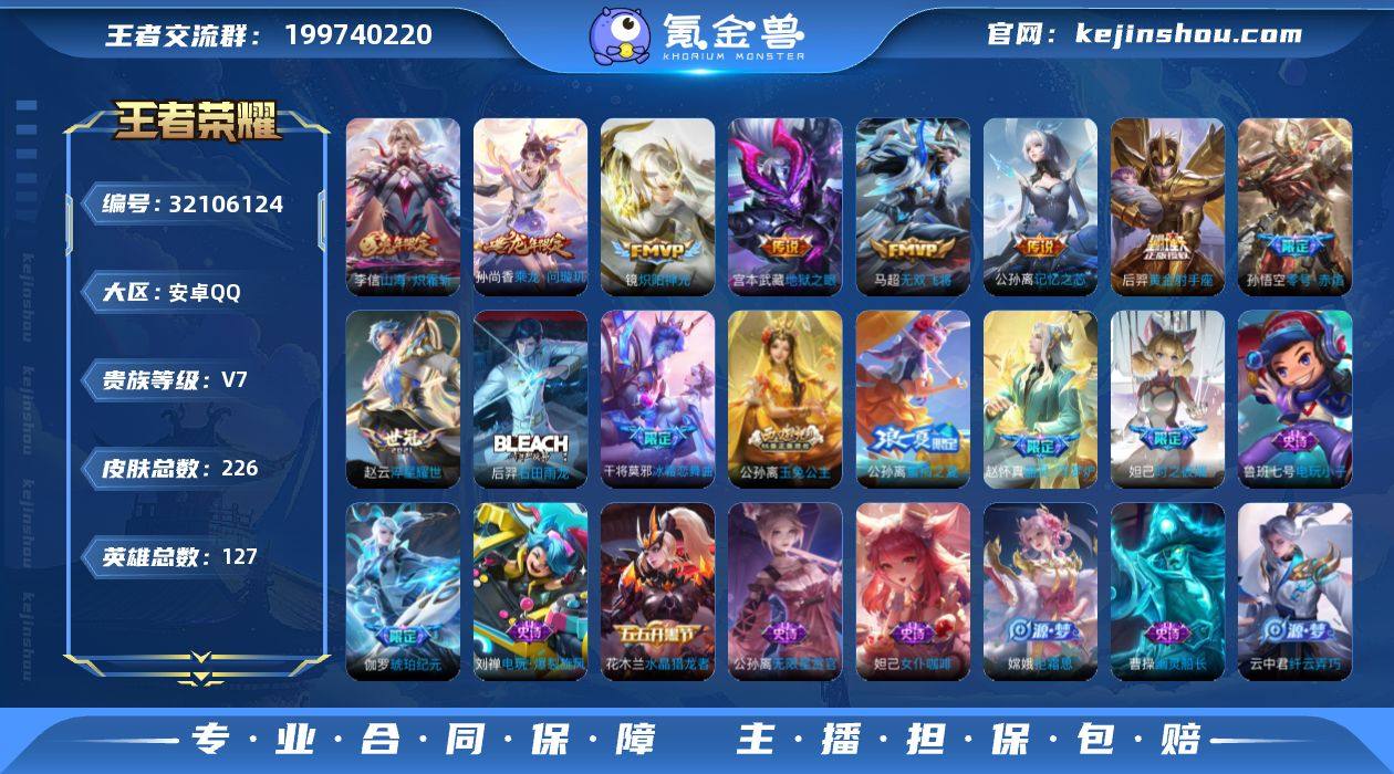 V7 20传说 127英雄 226皮肤 可修改实名 男号 【英雄全皮】敖隐全皮,空空儿全皮,孙权全皮,蚩奼全皮,影全皮,大禹全皮 【稀有英雄】敖隐(小龙人),大司命,韩信(韩跳跳),夏洛特(夏师傅),艾琳,橘右京(橘子),娜可露露(鸟人),不知火舞,赵云,金蝉(唐僧),戈娅 【传说皮】乘龙·问璇玑(孙尚香年限),神树通天,山海·炽霜斩(李信年限),黄金射手座,零号·赤焰,地狱之眼,淬星耀世,炽阳神光,无双飞将,记忆之芯(机甲兔) 【珍宝阁皮】万物之道,蔷薇恋人,女武神 【赛季/战令皮】古海寻踪(s33),星界游侠,海盐诗旅(s30),擒涛扼浪(s31),探海日志(s32),顽趣-梦奇,剑破天穹(s35),天穹祈灯(s34),暖冬·兔眠,混沌棋(s18),疑决卦(s19),醍醐杖(s20),原初探秘者(s21),万华元夜(s22),演武夺筹(s23),驱傩正仪(s24),千军破阵(s25),星空之诺,银河之约,潮玩骑士王,云间偶戏,沙漠行僧(s26),金庭之子(s27),大漠名商(s28),云中旅人(s29) 【史诗皮】器灵·浮梦炉,琥珀纪元伽罗,蔬乡物语(鲁班七号),怒海争锋,线条小狗-周瑜,涂山容容,石田雨龙,百相守梦-黄忠,紫霞仙子,电玩小子(小书包),蒙恬荣光圣徽,百解令(蒙犽),匿光侦查者,无限星赏官,冰冠公主,银翎春语,电玩·爆裂旋风,乱世虎臣,节奏热浪,女仆咖啡,水果甜心,星夜王子,功夫厨神,德古拉伯爵,暗隐猎兽者,幽灵船长,鬼剑武藏,心灵战警,舞动绿茵,纤云弄巧,拒霜思,缤纷独角兽,乘风破浪,逐浪之夏,水晶猎龙者,金属风暴,原初追逐者,圣诞恋歌,鹰眼统帅,魅力维加斯,黎明之约,无心 【限定皮】愿照·岁时盈(虞姬年限),鸣野蒿,白虎志(电光耗子),凤求凰(白切鸡),绯月行,时之彼端,时雨天司(水龙头),五谷丰年,御风骁将(吕布年限),奔雷神使(牛魔年限),祈雪灵祝(雪兔子),李小龙,永曜之星,霸王别姬-虞姬,默契交锋-兰陵王,默契交锋-花木兰,冰霜恋舞曲,云端筑梦师,蜜橘之夏,玉兔公主,深海之息(深海大菠萝) 【普通