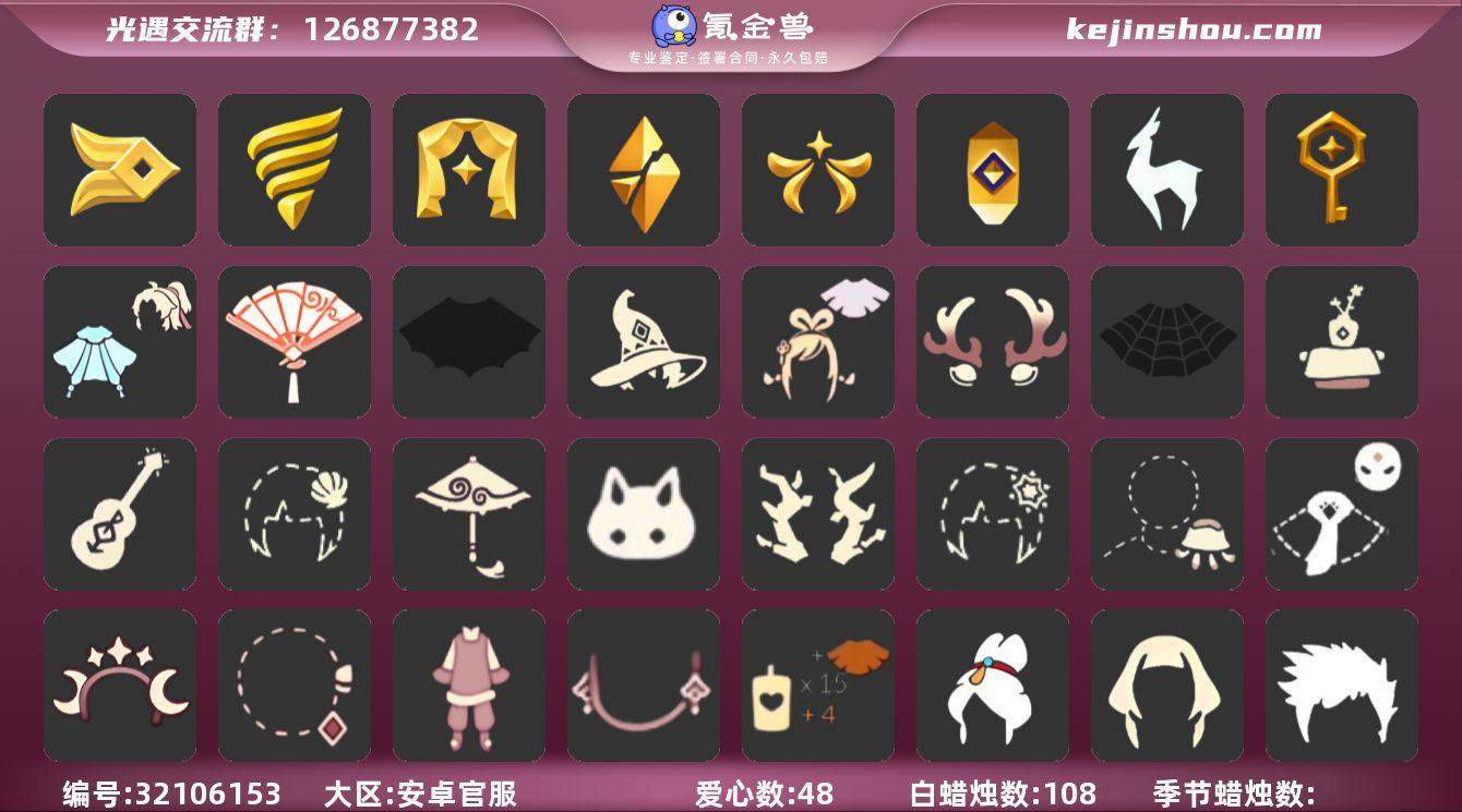 账号类型: 手机账号 季节已毕业: 风行季,潜海季,表演季,破晓季,欧若拉季,追忆季,九色鹿季,筑巢季 完成地图: 雨林,霞谷,暮土 珍稀物品: 白枭,透明蝶翼斗 礼包: 蝙蝠套,巫师,绊爱,鹿角,蜘蛛斗,茶桌,吉他,贝壳,红伞,兔子,枯角,雪花,水母,猫套,星月头饰,彩虹耳钉,新年裤,新年耳钉,创始人,献瑞折扇礼包,青衫落拓礼包 裤子: 武士裤,搓澡巾,王子服,蓝绿裤,飞天裤,筑巢季·裤子 面具: 呼吸面具,夜行毕业面具,黄眉企鹅面具 面饰: 红耳机,青鸟毕业面饰 项链: 围巾 发型: 归巢毕业发型,若笠,虚荣,单侧绑发,小王子发型,留辫蘑菇头,飞天盘发 头饰: 羽毛发饰,平顶帽 斗篷: 海洋斗,绿芽,遥鲲斗篷,燕尾斗篷,冥龙斗篷 配饰: 雨伞,筑巢季·小手办,高音钢琴,鲲灯 亮点: 【优质装备】:表演季,白枭(帝企鹅发),武士裤,风行季,潜海季,破晓季,透明蝶翼斗,欧若拉季(欧若拉),归巢毕业发型(五塑彩羽发),羽毛发饰(多羽发饰),筑巢季·小手办(光之子试衣),高音钢琴(白色高脚钢琴),追忆季,九色鹿(九色鹿季),王子服(小王子套装),蓝绿裤(高领舞服),飞天裤(柔缎花边连)(九色鹿丝带裤),围巾(肩带),筑巢季,筑巢季·裤子(设计师长袍),呼吸面具(潜水面具),夜行毕业面具(棕熊面具),黄眉企鹅面具,单侧绑发(单边小辫),小王子发型,留辫蘑菇头,遥鲲斗篷(双翼遥鲲斗),燕尾斗篷,冥龙斗篷,鲲灯(追忆之书),飞天盘发(九色鹿丸子头),青鸟毕业面饰(青鸟面饰),蝙蝠套(蝙蝠斗篷)(南瓜头),绊爱(绊爱斗篷)(绊爱礼包),茶桌(花憩茶桌),猫套(皮皮猫斗)(皮皮猫礼包),红耳机,鹿角(圣诞鹿角),蜘蛛斗(蛛丝斗篷)(蛛网斗篷),吉他(音韵吉他)(白吉他),红伞(瑞气纸伞),巫师(巫师帽),枯角(巫树犄角),新年裤(瑞气服饰),雨林,霞谷,墓土(暮土),若笠(箬笠),星月头饰(星月头冠),创始人(创始人斗篷),献瑞折扇礼包,青衫落拓礼包,兔子(玉兔头饰)(玉兔发饰)(兔子发饰),水母(水母肩饰),彩虹耳钉(彩虹...