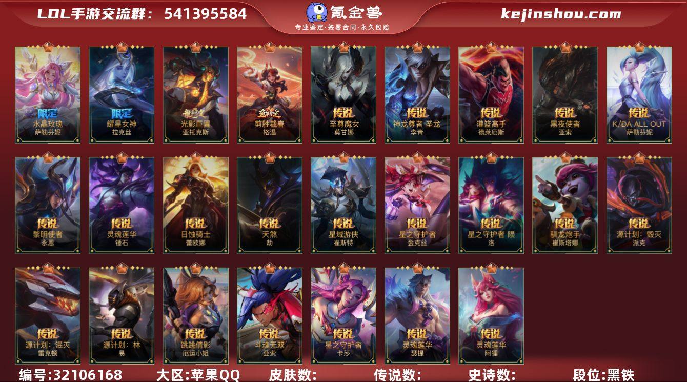2神话 3限定 28传说 86史诗 162皮肤 可二次 可修改实名 【段位】大师 【神话皮】桃映暖春 灼灼芳菲 拉克丝,玄龙绛天 易 【限定皮肤】耀星女神拉克丝,美猴王,山海绘卷狗熊 【传说皮】至尊魔女 莫甘娜,神龙尊者 圣龙 李青,光影巨翼亚托克斯,源计划:毁灭,水晶玫瑰萨勒芬妮,灵魂莲华腕豪,灵魂莲华阿狸,翩翩绣蕊 霞,凝辉黯刃 泰隆,星之守护者卡莎,天煞劫,日蚀骑士蕾欧娜,星域游侠卡牌,K/DA ALLOUT萨勒芬妮,黑夜使者亚索,灌篮高手,星之守护者金克丝,剪胜裁春格温,斗魂无双亚索,跳跳倩影女枪,耀星女神拉克丝,源计划:泯灭,源计划:林,黎明使者永恩,灵魂莲华锤石,源计划:净化,驯龙炮手,星之守护者 陨