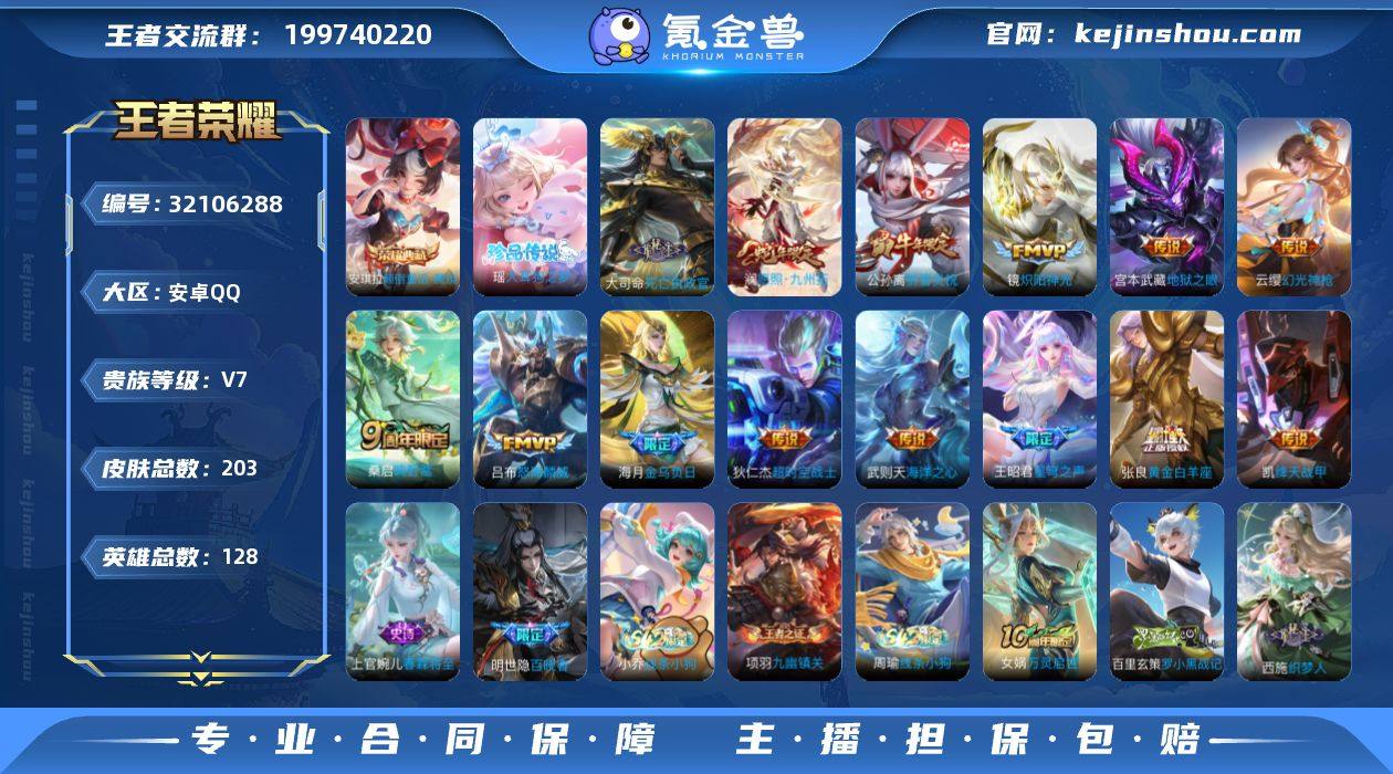 实名: 可修改 性别: 女号 贵族等级: V7 英雄数: 128 皮肤数: 203 荣耀水晶: 颠倒童话·魔镜 珍品传说: 大耳狗之梦 传说皮: 绛天战甲,黄金白羊座,炽阳神光,海洋之心,地狱之眼,超时空战士-狄仁杰,金乌负日,幻光神枪,死亡执政官 限定皮: 李小龙,祈雪灵祝,时之彼端,百木心枪,星穹之声,五谷丰年,怒海麟威,鸣野蒿,逐霄战戟,愿照·九州拓 亮点: 【优质装备】:大耳狗之梦,绛天战甲(鸡嘴战神),黄金白羊座,炽阳神光,海洋之心,地狱之眼,超时空战士-狄仁杰,金乌负日,颠倒童话·魔镜