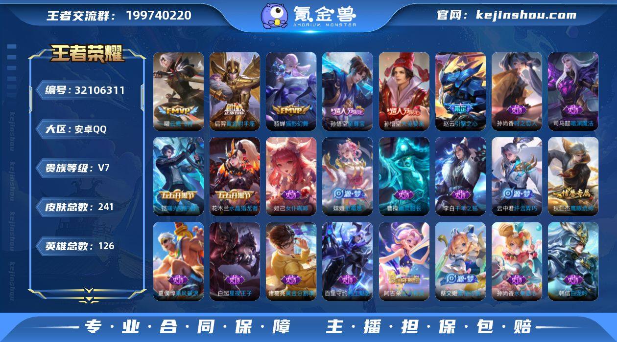 英雄 241皮肤 可修改实名 男号 【稀有英雄】大司命,嬴政(始皇帝),韩信(韩跳跳),夏洛特(夏师傅),艾琳,橘右京(橘子),娜可露露(鸟人),不知火舞,赵云,金蝉(唐僧),戈娅 【传说皮】神树通天,黄金射手座,猫影幻舞,云鹰飞将(小将军),超时空战士-狄仁杰 【珍宝阁皮】蔷薇恋人,玩趣恶龙 【赛季/战令皮】噬灭天穹(s37),古海寻踪(s33),海盐诗旅(s30),擒涛扼浪(s31),探海日志(s32),剑破天穹(s35),天穹祈灯(s34),天穹之誓(s36),凯尔特女王(s7),狰(s8),饕餮(s9),烛龙(s10),穷奇(s12),御狮(s13),御霄(s14),御旌(s15),御銮(s16),朔风刀(s17),混沌棋(s18),疑决卦(s19),醍醐杖(s20),原初探秘者(s21),万华元夜(s22),演武夺筹(s23),驱傩正仪(s24),猎兽之王,白昼王子,朔望之晖,神迹守卫-钟馗,狮舞东方,赤莲之焰,驯魔猎人,星空之诺,银河之约,夺宝奇兵,迷踪丽影,大漠名商(s28),云中旅人(s29) 【史诗皮】紫霞仙子,白龙吟,黄金分割率,特工魅影,千年之狐,江河有灵,蒙恬荣光圣徽,百解令(蒙犽),冰冠公主,偶像歌手,末日机甲-吕布,时之恋人-孙尚香,乱世虎臣,节奏热浪,女仆咖啡,摇滚巨星,水果甜心,星夜王子,功夫厨神,德古拉伯爵,幽灵船长,鬼剑武藏,暗渊魔法,纤云弄巧,繁星吟游(呼啦呼啦),拒霜思,缤纷独角兽,乘风破浪,水晶猎龙者,曙光守护者,金属风暴,圣诞狂欢,圣诞恋歌,鹰眼统帅,暗夜贵公子,魅力维加斯,未来纪元-赵云 【限定皮】至尊宝,遇见飞天,梁祝,天狼狩猎者,天狼征服者,李小龙,朱雀志(守约年限),猪悟能,大圣娶亲,引擎之心,山海·玄木吟(马可年限) 【普通皮】谧流熔炉,动物派对,雪境奇遇-西施,星梦巡礼,劲辣红锅,大乔绒语心约,春野之旅,漠中幻影,功夫炙烤,亚瑟鸿运当头,街头霸王,朵莉亚金色潮汐,龙舞盛年,熔金海岸,程咬金群星魔术团,鹤鸣心笺,聚星闪耀,太极少年,零食大作战,妄想特派,热血海滩,王牌新星,鬼