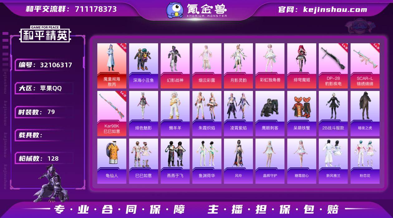 YZJ14997 可二次 苹果Q-1红装5粉装3特效枪10热门79套装128枪皮 39559热力值 极品红装素材号 双字ID(七枤)2级敖丙 幻影战神 彩虹独角兽 烟云彩露 暗夜之虎 深海小丑鱼 晶辉守护 2P小姐姐 懒羊羊 4印记 历史超级王牌5星 【1红装】 魔童闹海-敖丙 (2级) 【5粉装】 绯穹魔姬 月影灵韵 烟云彩露 彩虹独角兽 幻影战神 【3特效枪】 SCAR-L-锦绣绵绵 (5级) Kar98K-巳巳如意 (5级) DP-28-豹影疾电 (5级) 【10热门】 龟仙人 暗夜之虎 2B战斗服款 晶辉守护 呆萌铁蟹 鹰眼刺客 暗夜之虎 深海小丑鱼 破蛋小黄鸡 M762-奇异狩猎者 【1背包】 深海小丑鱼背包 营地ID:953466793