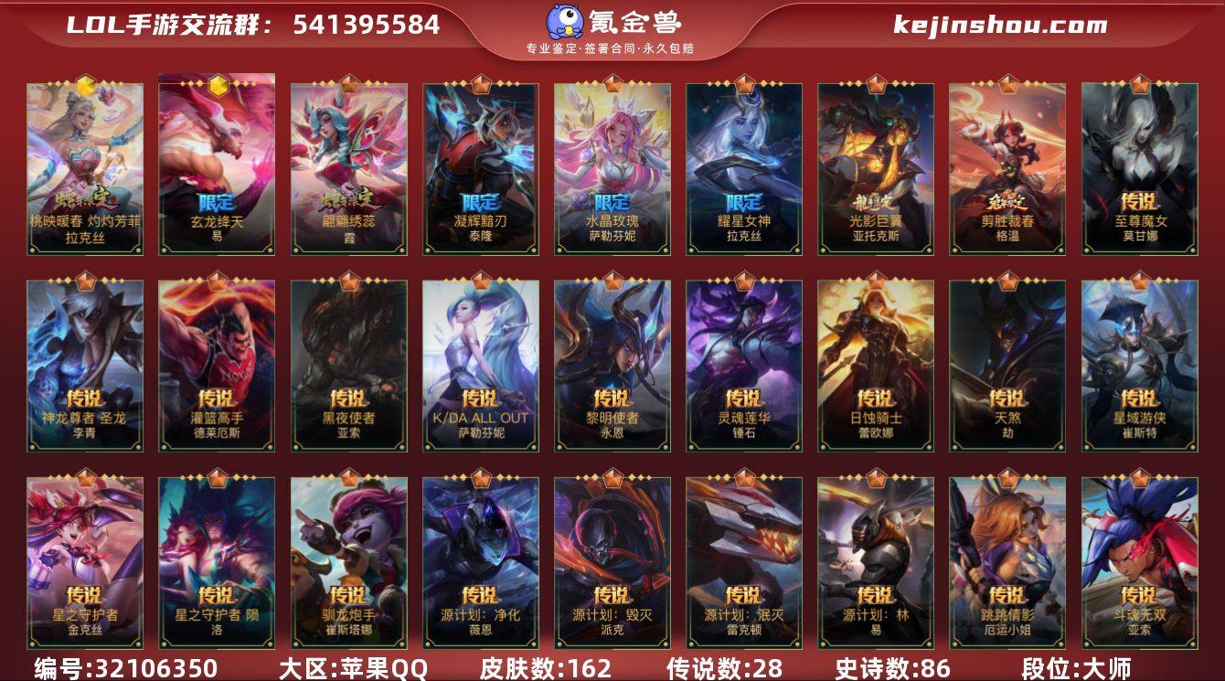 实名: 可修改 段位: 大师 皮肤数: 162 神话皮: 玄龙绛天 易,桃映暖春 灼灼芳菲 拉克丝 限定皮肤: 美猴王,山海绘卷狗熊,耀星女神拉克丝 传说皮: 灌篮高手,黑夜使者亚索,K/DA ALLOUT萨勒芬妮,日蚀骑士蕾欧娜,天煞劫,星域游侠卡牌,星之守护者金克丝,星之守护者 陨,驯龙炮手,源计划:净化,灵魂莲华锤石,剪胜裁春格温,黎明使者永恩,源计划:林,源计划:泯灭,耀星女神拉克丝,跳跳倩影女枪,斗魂无双亚索,星之守护者卡莎,灵魂莲华阿狸,灵魂莲华腕豪,水晶玫瑰萨勒芬妮,源计划:毁灭,光影巨翼亚托克斯,神龙尊者 圣龙 李青,至尊魔女 莫甘娜,凝辉黯刃 泰隆,翩翩绣蕊 霞 亮点: 【优质装备】:灌篮高手,黑夜使者亚索,K/DA ALLOUT萨勒芬妮,日蚀骑士蕾欧娜,天煞劫,星域游侠卡牌,星之守护者金克丝,星之守护者 陨,驯龙炮手,源计划:净化,玉剑传说 武剑仙,灵魂莲华锤石,剪胜裁春格温,源计划:林,源计划:泯灭,耀星女神拉克丝,跳跳倩影女枪,星之守护者卡莎,灵魂莲华阿狸,灵魂莲华腕豪,水晶玫瑰萨勒芬妮