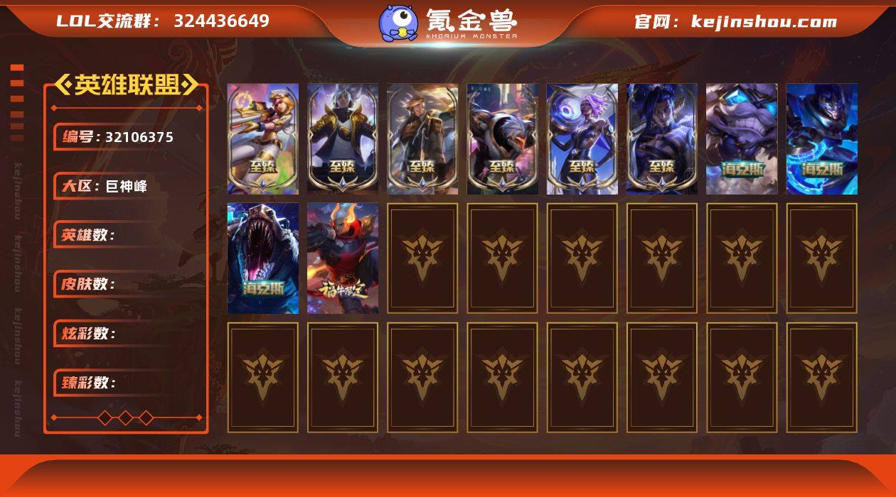 1终极 13神话 49限定 50传说 112史诗 441皮肤 120炫彩 172英雄 可二次 可修改实名 【至臻】至臻 电玩女神 凯特琳,至臻 真实伤害 亚索,至臻 灵能特工 伊泽瑞尔,至臻 源计划:阴 劫,至臻 魔女 乐芙兰,至臻 月蚀骑士 赛娜,至臻 至高天 奎桑提 【海克斯】海克斯 吉格斯,海克斯 嘉文四世,海克斯 雷克顿 【赛季限定皮】胜利凤凰 艾尼维亚,胜利女神 娑娜,胜利巨口 克格莫,胜利之王 泰达米尔,胜利女神 莫甘娜,胜利女神 希维尔,胜利之树 茂凯,胜利枪神 格雷福斯,胜利之剑 亚托克斯,胜利枪神 卢锡安,胜利机器人 布里茨 【冠军限定系列】S13 T1 李青,S2 暗杀星 蒙多,S2 暗杀星 慎,S3 SKT T1 贾克斯,S3 SKT T1 李青,S3 SKT T1 婕拉,S6 SKT T1 扎克,S7 SSG 嘉文四世,S7 SSG 洛,S7 SSG 霞,S7 SSG 伊泽瑞尔 【冰雪节限定】冰封王子 蒙多,胡桃夹子 萨科,魄罗骑士 瑟庄妮,圣诞开心鬼 提莫,圣诞精灵 崔丝塔娜,圣诞狂欢 努努和威朗普,喜庆之树 茂凯,邪恶圣诞老人 维迦,雪球也能爆炸!吉格斯,雪装 奈德丽 【泳池派对】泳池派对 吉格斯,泳池派对 蕾欧娜 【万圣节限定】南瓜头 费德提克,无头骑士 赫卡里姆 【年限】点心宝贝 阿木木,天龙之子 斯莫德,神龙烈焰 金克丝,玉净夜叉 凯特琳,纳财大帝 塔姆,福牛守护者 嘉文四世 【周年】10周年 安妮,10周年 凤凰 【其他限定/神话皮】暗裔英雄 盖伦,源代码 乐芙兰,防暴天使 凯尔,暗影 沃里克,波比的巧克力工坊,都铎王朝 图奇,蒙多蒙多,密林猎手 提莫,永恒之森 乐芙兰,制胜金靴 李青