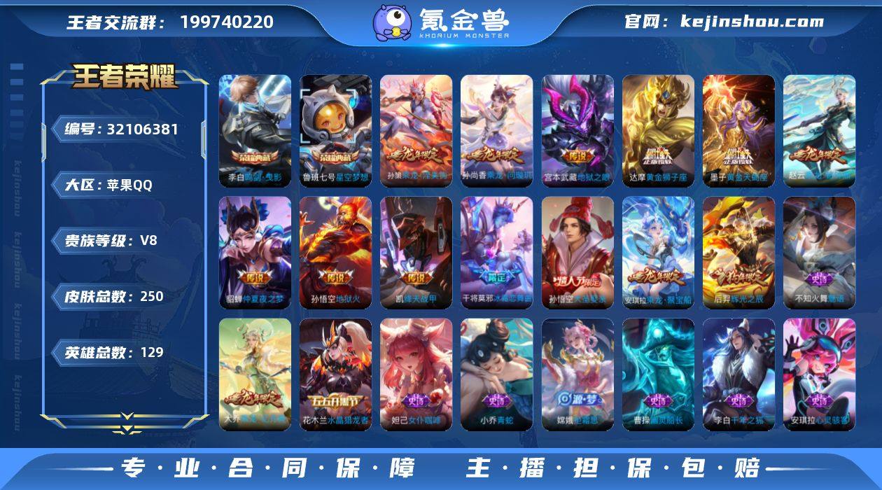 V8 2典藏 13传说 129英雄 250皮肤 典藏英雄武则天 可修改实名 男号 【英雄全皮】大禹全皮 【稀有英雄】敖隐(小龙人),大司命,嬴政(始皇帝),韩信(韩跳跳),夏洛特(夏师傅),艾琳,橘右京(橘子),娜可露露(鸟人),不知火舞,赵云,金蝉(唐僧),戈娅 【荣耀水晶】鸣剑·曳影,星空梦想(太空人) 【传说皮】黄金天蝎座,乘龙·淬吴钩(孙策年限),乘龙·铭钟鼎(赵云年限),乘龙·问璇玑(孙尚香年限),黄金狮子座,地狱火,仲夏夜之梦(大飞蛾),地狱之眼,绛天战甲(鸡嘴战神),超时空战士-狄仁杰 【珍宝阁皮】妄想食味,蔷薇恋人 【赛季/战令皮】海盐诗旅(s30),擒涛扼浪(s31),探海日志(s32),剑破天穹(s35),天穹祈灯(s34),烛龙(s10),重明(s11),穷奇(s12),御狮(s13),御霄(s14),御旌(s15),御銮(s16),朔风刀(s17),混沌棋(s18),疑决卦(s19),醍醐杖(s20),原初探秘者(s21),万华元夜(s22),演武夺筹(s23),驱傩正仪(s24),千军破阵(s25),猎兽之王,白昼王子,朔望之晖,蓝屏警告,赤莲之焰,驯魔猎人,星空之诺,银河之约,西部大镖客-猪八戒,暗影游猎(游乐娃子),单词大作战,狂想玩偶喵,潮玩骑士王,云间偶戏,星际陆战队-达摩,胡桃异想国,神迹守卫-墨子,航海奇遇记,沙漠行僧(s26),金庭之子(s27),大漠名商(s28),云中旅人(s29),超时空战士-钟无艳,落雪兰心 【史诗皮】乘龙·忆丹青(大乔年限),乘龙·聚宝船(安琪拉年限),蔬乡物语(鲁班七号),紫霞仙子,苍穹之光,白龙吟,特工魅影,千年之狐,高渐离燃音魔法,江河有灵,冰冠公主,青蛇,偶像歌手,龙骑士(小龙虾),魅语,末日机甲-吕布,猫狗日记-孙策,猫狗日记-大乔,乱世虎臣,节奏热浪,女仆咖啡,摇滚巨星,水果甜心,天才门将,星夜王子,心灵骇客,功夫厨神,德古拉伯爵,暗隐猎兽者,幽灵船长,鬼剑武藏,心灵战警,舞动绿茵,地狱岩魂,诗语江南,纤云弄巧,繁星吟游(呼啦呼啦),拒霜思,缤纷独角兽