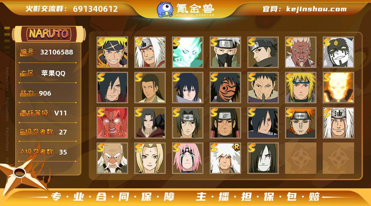 实名: 可修改 贵族等级: V11 S忍数: 27 A忍数: 35 战力值(万): 906 S级忍者: 千手柱间「秽土转生」,宇智波鼬「秽土转生」,宇智波斑 「木叶创立」,佩恩「天道」,大蛇丸,波风水门,纲手,自来也,宇智波鼬 「须佐能乎」,迈特凯「死门」,大野木 「忍界大战」,宇智波带土 「忍界大战」,自来也 「舞之豪杰」,漩涡鸣人 「九喇嘛连结」,春野樱 「忍界大战」,神秘面具男 「红夜之刃」,宇智波佐助「永恒万花筒」,千手柱间·木叶创立,宇智波斑「秽土转生·解」,大筒木桃式,艾「忍界大战」,宇智波止水「须佐能乎」,旗木卡卡西「须佐能乎」,大筒木舍人 「最终章」,自来也 「传说中的三忍」,漩涡鸣人·宇智波佐助 亮点: 【优质装备】:千手柱间「秽土转生」,宇智波鼬「秽土转生」,宇智波斑 「木叶创立」,迈特凯「死门」,宇智波带土 「忍界大战」,漩涡鸣人 「九喇嘛连结」,春野樱 「忍界大战」,神秘面具男 「红夜之刃」,宇智波佐助「永恒万花筒」,千手柱间·木叶创立,宇智波斑「秽土转生·解」,大筒木桃式,艾「忍界大战」,宇智波止水「须佐能乎」,旗木卡卡西「须佐能乎」,大筒木舍人 「最终章」,自来也 「传说中的三忍」霸体lv8