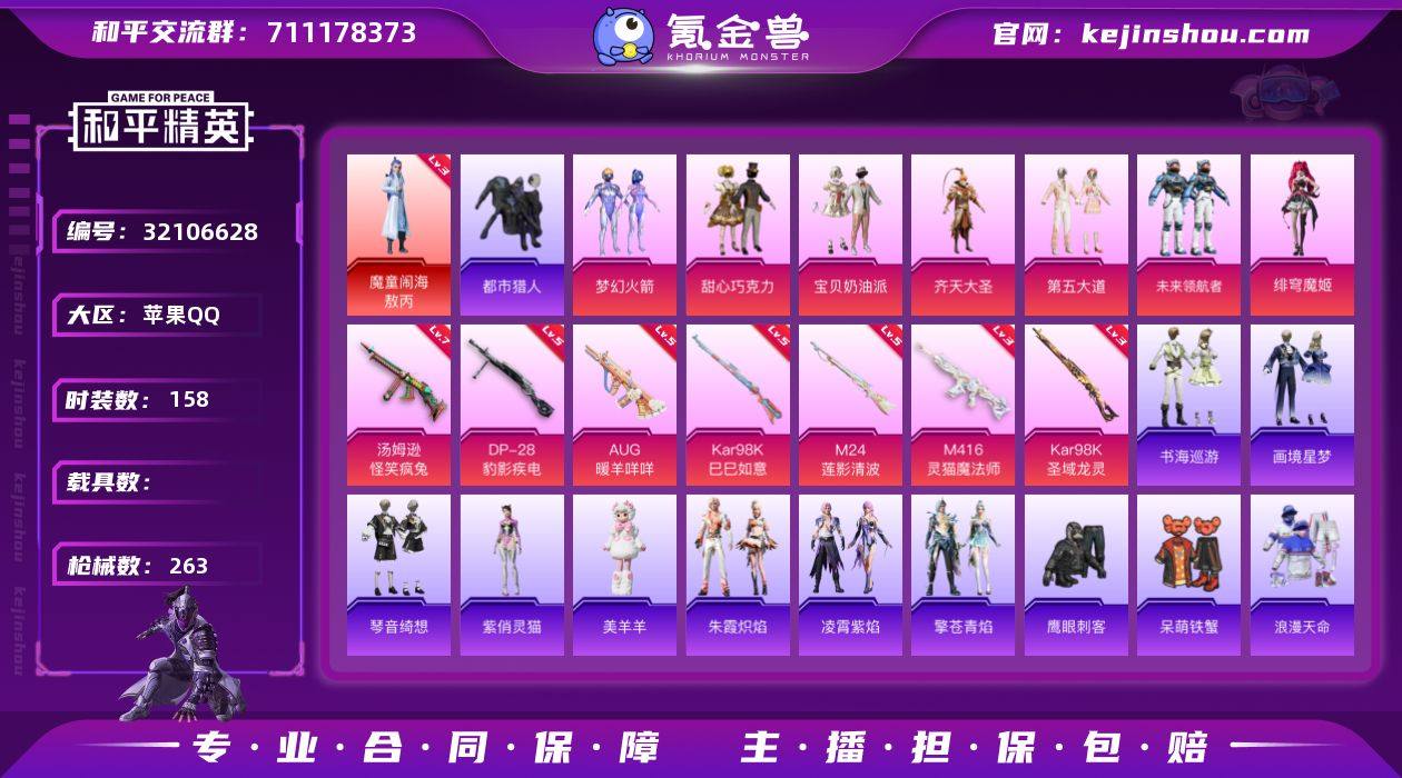 YZJ15070 可二次 苹果Q-1红装2稀有7粉装7特效枪11热门158套装263枪皮 78167热力值 极品红装素材身法号 地铁满天赋 三字ID(谈少妇)M4灵猫 98K圣域龙灵 3级敖丙 新火箭少女 甜心巧克力 第五大道 齐天大圣 都市 天命 美羊羊 满级汤姆逊怪笑疯兔 4印记 历史卓越王牌18星 【1红装】 魔童闹海-敖丙 (3级) 【2稀有】 都市猎人 浪漫天命 【7粉装】 梦幻火箭 绯穹魔姬 宝贝奶油派 甜心巧克力 未来领航者 第五大道 齐天大圣 【7特效枪】 M416-灵猫魔法师 (3级) Kar98K-圣域龙灵 (3级) Kar98K-巳巳如意 (5级) DP-28-豹影疾电 (5级) AUG-暖羊咩咩 (5级) 汤姆逊-怪笑疯兔 (7级) M24-莲影清波 (5级) 【11热门】 龟仙人 呆萌铁蟹 鹰眼刺客 赛罗奥特曼 团圆交子 瑞龙福将 粉红小猪 漫步者 破蛋小黄鸡 极速红龙 M762-瑞龙福将 【3飞行器】 龙翔九天飞行器 太空嘟嘟飞行器 天之羽翼飞行器 【1背包】 梦幻火箭背包 营地ID:795115463