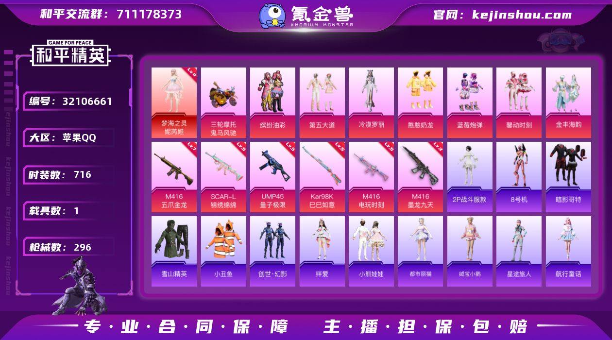 【特价出售】 QQ钱包无法注销苹果Q-1红装1载具7粉装6特效枪21热门203套装296枪皮 99009热力值 14印记 历史卓越王牌12星 【1红装】 梦海之灵-妮芮妲 (4级) 【1载具】 鬼马风驰 【7粉装】 憨憨奶龙 金丰海韵 冷漠罗丽 缤纷油彩 第五大道 馨动时刻 蓝莓炮弹 【6特效枪】 M416-五爪金龙 (7级) SCAR-L-锦绣绵绵 (5级) M416-墨龙九天 (3级) M416-电玩时刻 (5级) Kar98K-巳巳如意 (5级) UMP45-量子极限 (5级) 【21热门】 8号机 Mark.06 小丑鱼 龟仙人 2P战斗服款 浪漫假日 雪山精英 动感兔斯基 潮萌小黄鸭 梦魇先生 呆萌铁蟹 奶芙汪汪 大橘为重 暗影哥特 团圆交子 瑞龙福将 黑色刀锋 英勇保护者 M762-瑞龙福将 M24-奇异狩猎者 Kar98K-深海曼妙 【4飞行器】 龙翔九天飞行器 幻海精灵飞行器 太空嘟嘟飞行器 天之羽翼飞行器 【1头盔】 精灵迷巫头盔 【3背包】 精灵迷巫背包 梦幻火箭背包 幻影战神背包