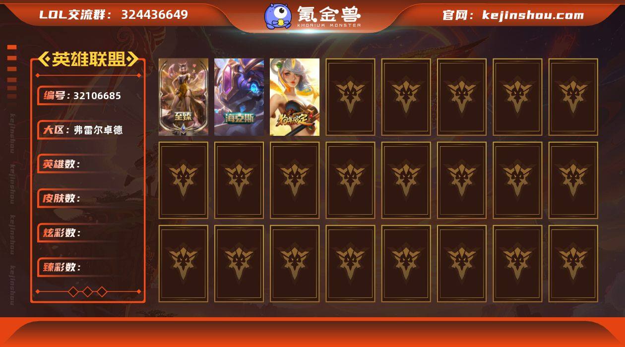 4神话 27限定 24传说 63史诗 257皮肤 27炫彩 166英雄 可二次 可修改实名 【至臻】至臻 K/DA 阿狸 【海克斯】海克斯 克格莫 【赛季限定皮】胜利之剑 亚托克斯 【冠军限定系列】S2 暗杀星 蒙多,S2 暗杀星 努努,S4 SSW 图奇 【冰雪节限定】冰雪风暴 希维尔,冰雪节 辛吉德,冰雪兽 纳尔,胡桃夹子 萨科,平安夜女神 娑娜 【泳池派对】泳池派对 吉格斯,泳池派对 凯特琳 【万圣节限定】鬼影森森 茂凯,克烈古拉伯爵,魅惑女巫 奈德丽,死亡誓约 维克托 【年限】定海神针 孙悟空,紫金罗刹 莫甘娜,春晖神女 拉克丝 【周年】5周年 阿狸,10周年 安妮 【其他限定/神话皮】源代码 乐芙兰,防暴天使 凯尔,暗影 沃里克,都铎王朝 图奇,防暴机器人 布里茨,防暴士兵 辛吉德,惊悚派对 阿木木,野兽猎人 德莱文,野兽猎人 瑟庄妮,勇者 阿狸
