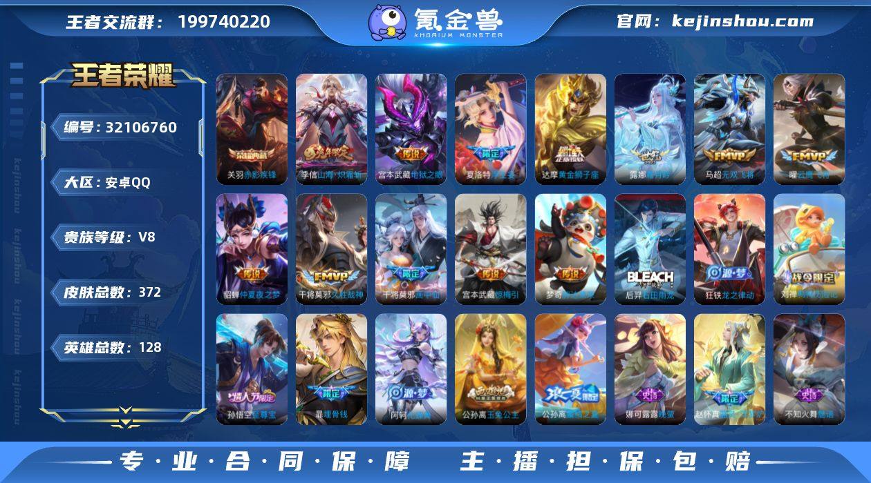 V8 2典藏 3珍品传说 27传说 128英雄 372皮肤 可修改实名 男号 【英雄全皮】司空震全皮,敖隐全皮,孙权全皮,蚩奼全皮,暃全皮,宫本武藏全皮,影全皮,大禹全皮 【稀有英雄】敖隐(小龙人),大司命,嬴政(始皇帝),韩信(韩跳跳),夏洛特(夏师傅),艾琳,橘右京(橘子),娜可露露(鸟人),不知火舞,赵云,金蝉(唐僧),戈娅 【荣耀水晶】九霄神辉(木兰典藏),赤影疾锋 【珍品传说】时之奇旅-孙策,朽木白哉,黑崎一护 【传说皮】吕布曦玄引,神树通天,山海·炽霜斩(李信年限),黄金狮子座,仲夏夜之梦(大飞蛾),地狱之眼,末日机甲-孙尚香(绿蚂蚱),久胜战神,云鹰飞将(小将军),无双飞将,胖达荣荣,超时空战士-狄仁杰,末日机甲-孙策,画中仙,浮生妄,惊梅引,霜月吟,澜逐花归海 【珍宝阁皮】妄想食味,优雅恋人,女武神 【赛季/战令皮】噬灭天穹(s37),古海寻踪(s33),星界游侠,海盐诗旅(s30),擒涛扼浪(s31),探海日志(s32),流音漫舞,顽趣-梦奇,地狱燃心,剑破天穹(s35),天穹祈灯(s34),青焰无极,苍威无极,天穹之誓(s36),蔡文姬夏日便利店,虞姬夏日便利店,暖冬·兔眠,烛龙(s10),御霄(s14),御旌(s15),御銮(s16),朔风刀(s17),混沌棋(s18),疑决卦(s19),醍醐杖(s20),原初探秘者(s21),万华元夜(s22),演武夺筹(s23),驱傩正仪(s24),千军破阵(s25),蓝屏警告,赤莲之焰,驯魔猎人,夺宝奇兵,迷踪丽影,单词大作战,狂想玩偶喵,潮玩骑士王,云间偶戏,神迹守卫-墨子,航海奇遇记,沙漠行僧(s26),金庭之子(s27),电玩高手(电玩铁子),午后时光,大漠名商(s28),云中旅人(s29),超时空战士-钟无艳,落雪兰心 【史诗皮】器灵·浮梦炉,星界战将,百相守梦-百里守约,撼地雄心,破空之剑,埋骨钱,怒海争锋,蔬乡物语(鲁班七号),琥珀纪元伽罗,茶境仙,百相守梦-黄忠,线条小狗-周瑜,九幽镇关,巫礼祀神,万灵启世,化蝶舞,涂山容容,织梦人,龙之律动,鸭鸭历险记