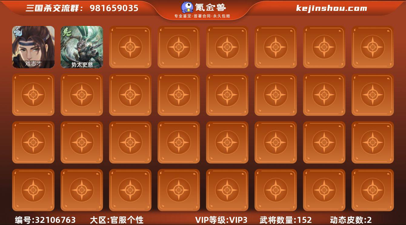 【1472】官阶:先锋将军;VIP等级:VIP3;史诗武将数量:2;动态皮肤数量:2;武将总数:152;史诗宝珠数量:0;将魂数量:2971;神将:1;魏国史诗武将:0;蜀国史诗武将:0;吴国史诗武将:1;群史诗武将:0 神周瑜,戏志才,势太史慈,神张辽-威震江东,关银屏-鼠年中秋(动态),诸葛果-蛇年限定(动态)