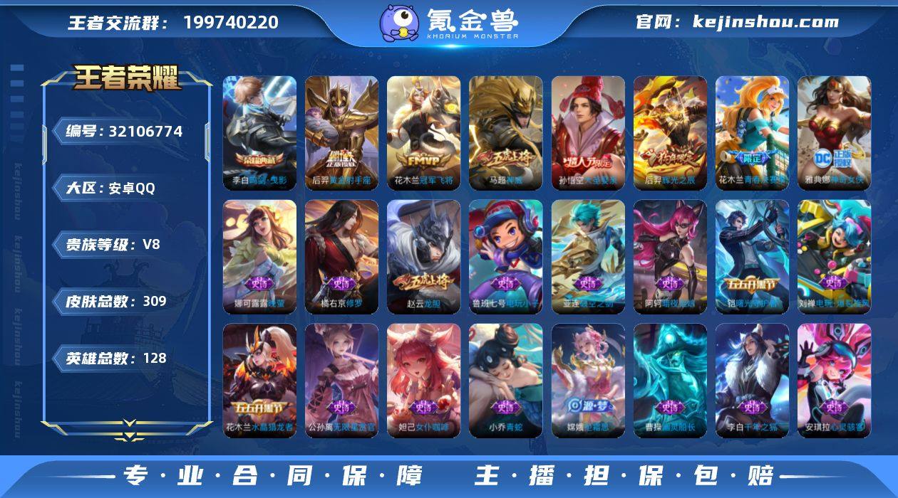 128英雄 309皮肤 可修改实名 男号 【英雄全皮】敖隐全皮,大禹全皮 【稀有英雄】敖隐(小龙人),大司命,嬴政(始皇帝),韩信(韩跳跳),夏洛特(夏师傅),艾琳,橘右京(橘子),娜可露露(鸟人),不知火舞,赵云,金蝉(唐僧),戈娅 【荣耀水晶】鸣剑·曳影,九霄神辉(木兰典藏) 【传说皮】黄金射手座,末日机甲-孙尚香(绿蚂蚱),冠军飞将 【珍宝阁皮】妄想食味,优雅恋人,女武神 【赛季/战令皮】噬灭天穹(s37),古海寻踪(s33),星界游侠,海盐诗旅(s30),擒涛扼浪(s31),潮玩骑兵,奇幻香踪,探海日志(s32),驭风魔法,玲珑珍味,流音漫舞,顽趣-梦奇,地狱燃心,剑破天穹(s35),天穹祈灯(s34),天穹之誓(s36),暖冬·兔眠,御銮(s16),朔风刀(s17),混沌棋(s18),疑决卦(s19),醍醐杖(s20),原初探秘者(s21),万华元夜(s22),演武夺筹(s23),驱傩正仪(s24),千军破阵(s25),朔望之晖,神迹守卫-钟馗,狮舞东方,迷踪丽影,西部大镖客-猪八戒,暗影游猎(游乐娃子),单词大作战,狂想玩偶喵,潮玩骑士王,云间偶戏,星际陆战队-达摩,胡桃异想国,神迹守卫-墨子,航海奇遇记,圣弓游侠,真爱魔法,火炮绅士,沙漠行僧(s26),幻夜卜梦,吟游魔法,夜都怪侠,金庭之子(s27),电玩高手(电玩铁子),午后时光,大漠名商(s28),云中旅人(s29),超时空战士-钟无艳,落雪兰心 【史诗皮】蔬乡物语(鲁班七号),破空之剑,线条小狗-周瑜,紫霞仙子,电玩小子(小书包),白龙吟,黄金分割率,特工魅影,千年之狐,蒙恬荣光圣徽,百解令(蒙犽),高渐离燃音魔法,无限星赏官,冰冠公主,青蛇,晚萤,江河有灵,暗夜猫娘,电玩·爆裂旋风,末日机甲-吕布,猫狗日记-孙策,猫狗日记-大乔,乱世虎臣,节奏热浪,修罗,女仆咖啡,摇滚巨星,水果甜心,天才门将,星夜王子,心灵骇客,功夫厨神,德古拉伯爵,暗隐猎兽者,幽灵船长,鬼剑武藏,心灵战警,天秀·启明,舞动绿茵,地狱岩魂,纤云弄巧,繁星吟游(呼啦呼啦),拒霜思,缤纷独