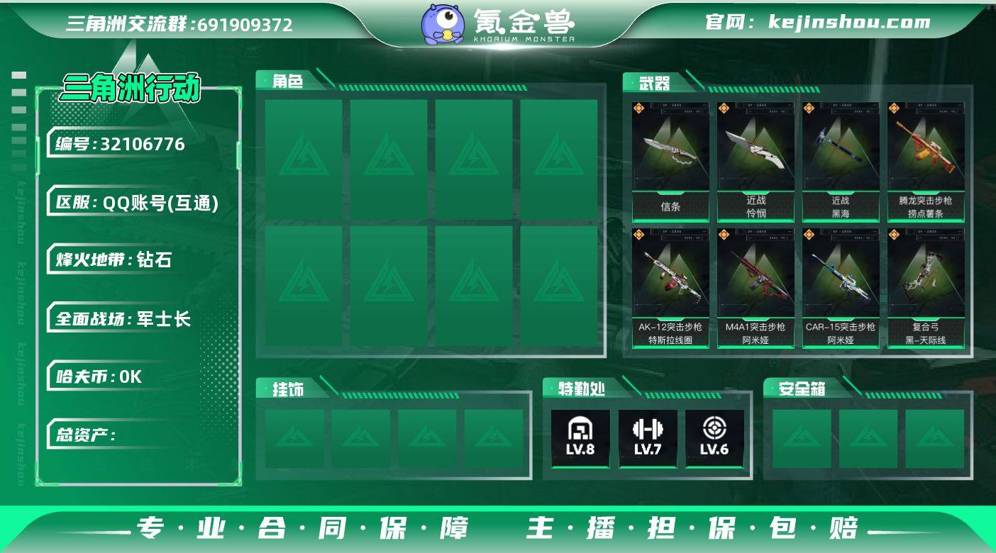 总资产:242.3M 2干员外观 3近战传说 38传说枪械 哈夫币:4.572K 不可修改实名 【烽火地带段位】:钻石 【全面战场段位】:军士长 【干员外观】:无名-夜鹰(S4),威龙-壮志凌云(S3) 【传说武器皮肤】:近战-怜悯,近战-黑海,近战-信条,AS Val突击步枪-蛇年祥瑞,SCAR-H战斗步枪-铁艺苍穹,AK-12突击步枪-特斯拉线圈,93R-捞点薯条,复合弓-黑-天际线,725双管霰弹枪-送葬人-无题密令,CAR-15突击步枪-阿米娅,腾龙突击步枪-捞点薯条,AWM狙击步枪-捞点薯条,M4A1突击步枪-阿米娅,G3战斗步枪-骑士,KC17突击步枪-电锯惊魂,M250通用机枪-几何解构,P90冲锋枪-信条,SR-25射手步枪-信条,SG552突击步枪-运动员,SR-9射手步枪-几何解构,K437突击步枪-几何解构,SR-3M紧凑突击步枪-特斯拉线圈,UZI冲锋枪-特斯拉线圈,勇士冲锋枪-能天使-午夜邮差,QJB201轻机枪-鹅鸭杀,M250通用机枪-骑士之心,R93狙击步枪-维什戴尔,SCAR-H战斗步枪-启航,ASh-12战斗步枪-鹅鸭杀,QCQ171冲锋枪-鹅鸭杀,M7战斗步枪-怜悯,M7战斗步枪-维京,M7战斗步枪-神秘艺术,ASh-12战斗步枪-怜悯,AK-12突击步枪-夜鹰,SMG45冲锋枪-骑士,QJB201轻机枪-黑海,MP5冲锋枪-黑海