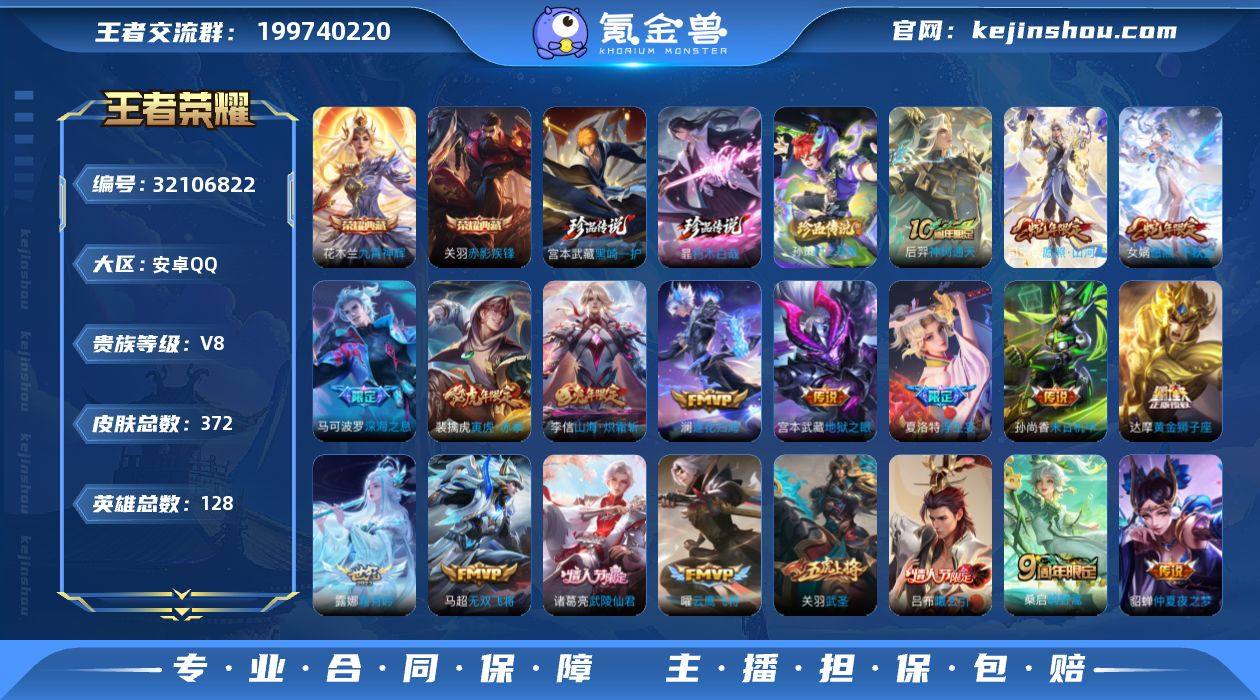 实名: 可修改 性别: 男号 贵族等级: V8 英雄数: 128 皮肤数: 372 荣耀水晶: 九霄神辉,赤影疾锋 珍品传说: 时之奇旅-孙策,朽木白哉,黑崎一护 传说皮: 黄金狮子座,云鹰飞将,久胜战神,末日机甲-孙尚香,仲夏夜之梦,地狱之眼,胖达荣荣,超时空战士-狄仁杰,末日机甲-孙策,无双飞将,山海·炽霜斩,画中仙,浮生妄,惊梅引,霜月吟,澜逐花归海,吕布曦玄引,神树通天 限定皮: 遇见飞天,李小龙,梁祝,龙胆,武圣,蜜橘之夏,飞衡,瑞麟志,至尊宝,武陵仙君,寅虎·赤拳,玉兔公主,深海之息,五谷丰年,诗剑行,鸣野蒿,逐霄战戟,愿照·千秋盛,愿照·山河定 亮点: 【优质装备】:九霄神辉(木兰典藏),赤影疾锋,朽木白哉,黑崎一护,黄金狮子座,云鹰飞将(小将军),久胜战神,末日机甲-孙尚香(绿蚂蚱),仲夏夜之梦(大飞蛾),地狱之眼,胖达荣荣,超时空战士-狄仁杰,末日机甲-孙策,无双飞将,山海·炽霜斩(李信年限),画中仙,浮生妄,惊梅引,霜月吟,澜逐花归海,涂山容容