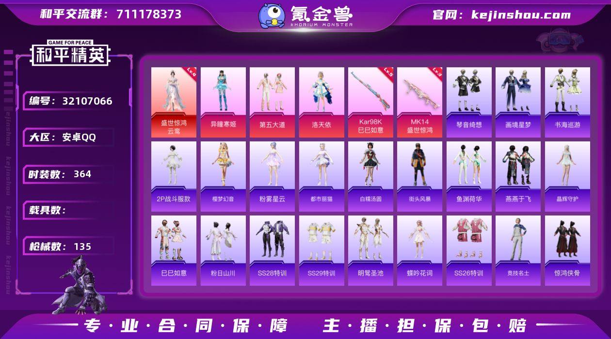 【特价出售】安卓Q-1红装3粉装2特效枪4热门104套装135枪皮 46479热力值 10印记 历史卓越王牌16星 【1红装】 盛世惊鸿-云鸾 (4级) 【3粉装】 洛天依 异瞳寒姬 第五大道 【2特效枪】 Kar98K-巳巳如意 (5级) Mk14-盛世惊鸿 (3级) 【4热门】 龟仙人 2P战斗服款 晶辉守护 破蛋小黄鸡 【1头盔】 幻影战神头盔