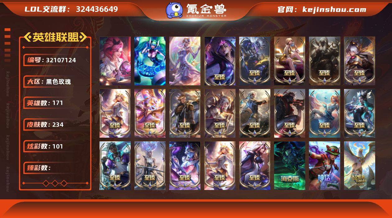 实名: 可修改 英雄数: 171 皮肤数: 234 炫彩数: 101 至臻: 至臻 源计划:正义 艾瑞莉娅,至臻 腥红之月 亚托克斯,至臻 K/DA 伊芙琳,至臻 索拉卡,至臻 太空律动 节奏幻师 璐璐,至臻 女帝 黛安娜,至臻 灵能特工 伊泽瑞尔,至臻 黑夜使者 凯隐,至臻 西部魔影 泰隆,至臻 海之歌 萨勒芬妮,至臻 星之守护者 艾克,至臻 星之守护者 辛德拉,至臻 海珀利安小队 迦娜,至臻 太空律动 魔音海妖 娜美,至臻 星之守护者 索拉卡,至臻 绝息圣堂 厄运小姐,至臻 魔域梦魇 泽丽,至臻 暗星女王 黛安娜 海克斯: 摄魂 薇恩 限定: 创星之灵 璐璐,玉剑传说 星仙子,双城之战2 微光实验室 辛吉德 情人节限定: 觅心猫猫 悠米 赛季限定皮: 胜利巨口 克格莫,胜利女神 娑娜,胜利剑圣 易,胜利之运 崔斯特 冠军限定系列: S2 暗杀星 蒙多,S2 暗杀星 慎,S4 SSW 泰隆,S4 SSW 炼金,S5 SKT T1 阿兹尔,S11 EDG 悠米 冰雪节限定: 冬季仙境 发条,寒冬精灵 璐璐,魄罗骑士 瑟庄妮,圣诞老人 古拉加斯,圣诞玩偶 波比,雪默丁格 万圣节限定: 魅惑女巫 崔丝塔娜,魅惑女巫 娜美,南瓜头 费德提克 年限: 定海神针 孙悟空 周年: 10周年 凤凰,12周年 劫,女帝 格温 其他限定/神话皮: 冠军典狱长 锤石,惊悚派对 阿木木,女猎手 希维尔,制胜金靴 李青,十五周年纪念 希维尔 亮点: 【优质装备】:至臻 源计划:正义 艾瑞莉娅,至臻 腥红之月 亚托克斯,至臻 K/DA 伊芙琳,至臻 索拉卡,至臻 太空律动 节奏幻师 璐璐,至臻 女帝 黛安娜,至臻 灵能特工 伊泽瑞尔,至臻 黑夜使者 凯隐,冠军典狱长 锤石,惊悚派对 阿木木,女猎手 希维尔,制胜金靴 李青,至臻 西部魔影 泰隆,至臻 海之歌 萨勒芬妮,至臻 星之守护者 艾克,大元素使,DJ-娑娜,K/DA ALL OUT-萨勒芬妮 独立音乐人,至臻 星之守护者 辛德拉,至臻 海珀利安小队 迦娜,至臻 太空律动 魔音海妖 娜美,至臻 星之守护者 索拉卡,至臻 绝息圣堂 厄...