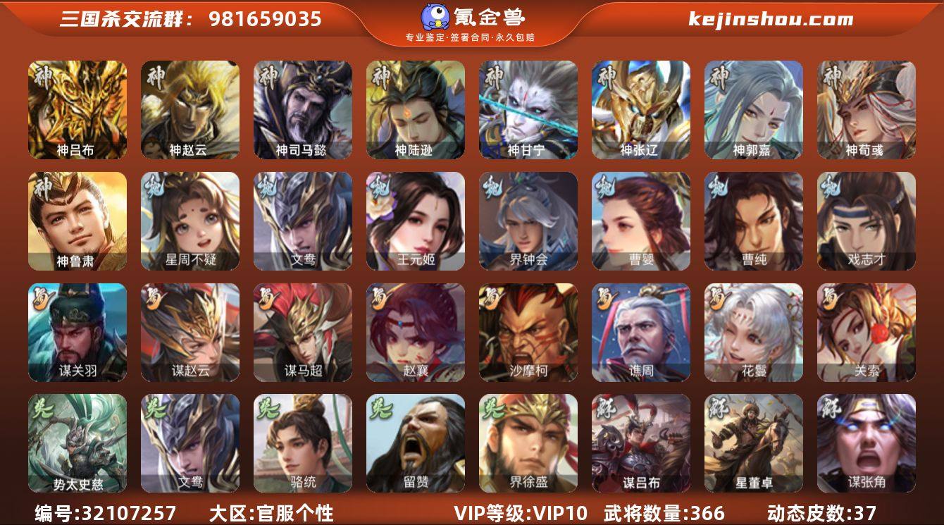 【1505】官阶:大将军;VIP等级:VIP10;史诗武将数量:41;动态皮肤数量:37;武将总数:366;史诗宝珠数量:2;将魂数量:9490;神将:9;魏国史诗武将:22;蜀国史诗武将:8;吴国史诗武将:4;群史诗武将:15 神吕布,神赵云,神司马懿,神陆逊,神甘宁,神张辽,神郭嘉,神荀彧,神鲁肃,星周不疑,文鸯,王元姬,魏-司马昭,界钟会,曹婴,曹纯,戏志才,关索,谋赵云,谋马超,赵襄,沙摩柯,谯周,花鬘,谋关羽,骆统,留赞,界徐盛,势太史慈,谋黄月英,左慈,张让,麹义,刘焉,界李儒,卑弥呼,鲍信,谋张角,张绣,李傕,阎象,许攸,谋吕布,星董卓,神鲁肃-九州为局,神郭嘉-虎年清明(动态),神太史慈-勇撼日月(动态),神荀彧-匡汉延祚(动态),神甘宁-万人辟易(动态),神司马懿-徐图大略,神曹操-天下归心,神司马懿-鉴往知来(动态),星周不疑-才广志宏(动态),张昌蒲-龙年端午(动态),曹植-龙年中秋(动态),曹丕-气荡山河(动态),甄姬-明珠耀躯(动态),曹丕-龙年中秋(动态),SP蔡文姬-兔年冬日(动态),曹婴-兔年春节(动态),王元姬-鼠年冬至(动态),司马昭-昭威淮南(动态),星徐晃-斧引霹雳(动态),花鬘-依心缱绻(动态),卧龙诸葛-龙跃凤鸣(动态),费祎-安民护祚(动态),关羽-明良千古(动态),黄月英-明良千古(动态),界黄月英-明良千古(动态),诸葛果-蛇年限定(动态),周处-义除三害(动态),吕蒙-剑起惊澜(动态),陆逊-龙年七夕(动态),黄盖-兔年端午(动态),孙权-永开吴祚(动态),孙寒华-莲华熠熠(动态),徐盛-破军杀将(动态),刘赞-灵魂歌王(动态),孙寒华-蛇年限定(动态),文鸯-势若万钧(动态),许攸-火烧乌巢(动态),吕布-虓虎之勇(动态),界吕布-虓虎之勇(动态),SP貂蝉-驭魂千机(动态),刘焉-雄踞益州(动态),皇甫嵩-奋钺振旅(动态),蔡文姬-以身证道(动态),左慈-蛇年限定(动态)