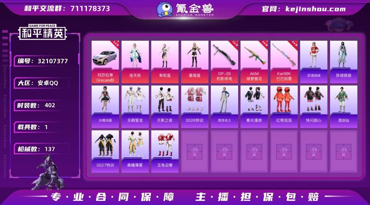 【特价出售】qq钱包无法注销 安卓Q-1载具3粉装3特效枪3热门102套装137枪皮 40662热力值 8印记 历史超级王牌16星 【1载具】 玛莎拉蒂G幻星粉 (5级) 【3粉装】 蔷薇星 茉莉星 洛天依 【3特效枪】 AKM-绿萝繁花 (5级) Kar98K-巳巳如意 (5级) DP-28-豹影疾电 (5级) 【3热门】 红熊茄茄 破蛋小黄鸡 极速红龙