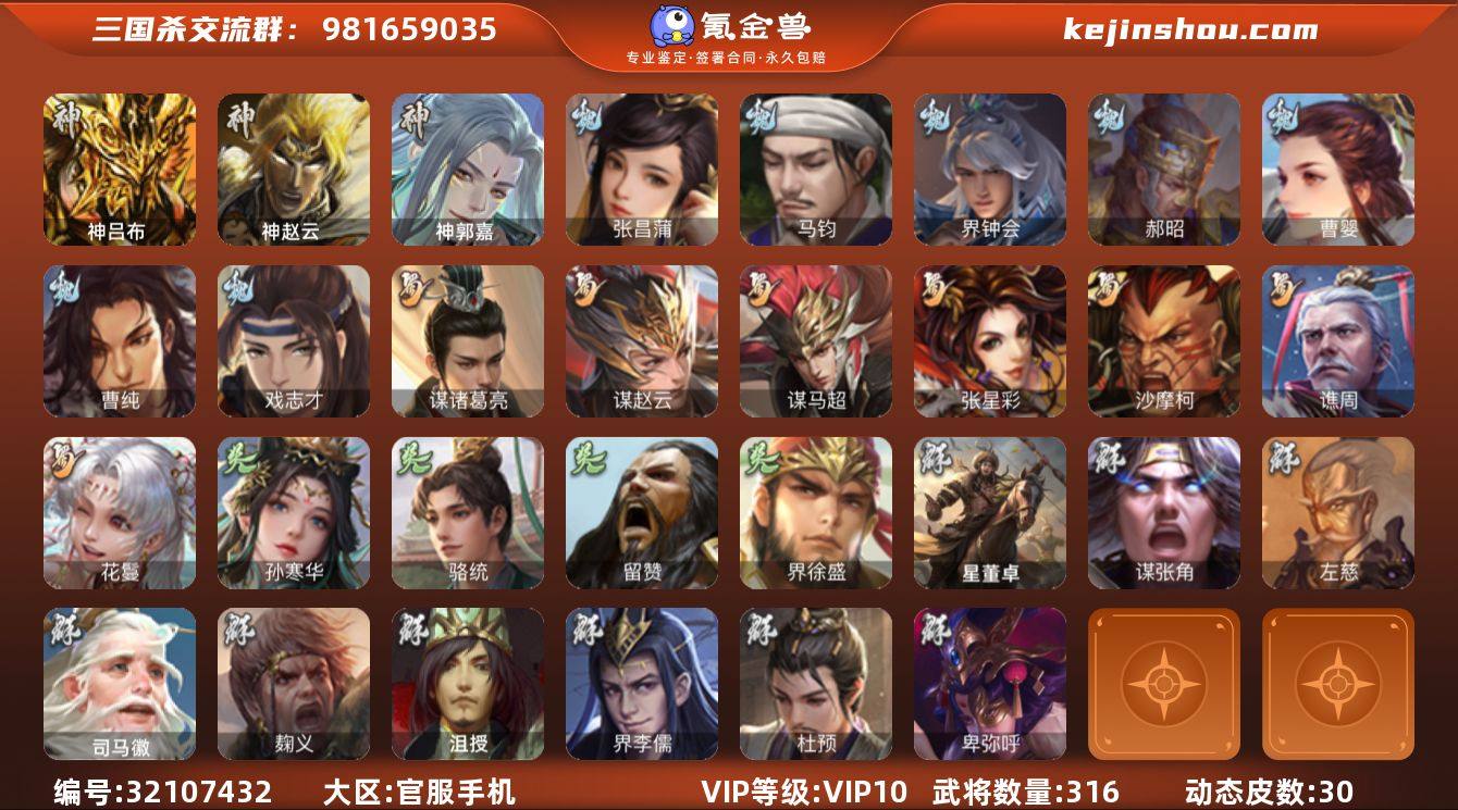 【1521】官阶:骠骑将军;VIP等级:VIP10;史诗武将数量:34;动态皮肤数量:30;武将总数:316;史诗宝珠数量:9;将魂数量:4156;神将:5;魏国史诗武将:18;蜀国史诗武将:7;吴国史诗武将:4;群史诗武将:11 神吕布,神赵云,神郭嘉,神吕蒙,神周瑜,张昌蒲,魏-司马昭,马钧,界钟会,郝昭,曹婴,曹纯,戏志才,谋诸葛亮,谋赵云,谋马超,张星彩,沙摩柯,谯周,花鬘,孙寒华,骆统,留赞,界徐盛,左慈,司马徽,麹义,沮授,界李儒,杜预,卑弥呼,谋张角,张绣,友徐庶,星董卓,神鲁肃-九州为局,神张辽-威震江东,神郭嘉-虎年清明(动态),神曹操-天下归心,神赵云-战龙在野(动态),星周不疑-才广志宏(动态),钟会-龙年端午(动态),曹植-龙年中秋(动态),SP蔡文姬-兔年冬日(动态),曹昂-竭战麟伤(动态),曹婴-兔年春节(动态),马钧-能工巧匠(动态),王元姬-鼠年冬至(动态),司马昭-昭威淮南(动态),刘备-龙御天下(动态),赵云-截江救主(动态),界赵云-截江救主(动态),马良-荡然由心(动态),诸葛果-蛇年限定(动态),卧龙诸葛-火烧博望(动态),小乔-兔年七夕(动态),太史慈-涤荡江东(动态),周处-义除三害(动态),孙寒华-莲华熠熠(动态),孙寒华-威灵尽显(动态),周瑜-免年清明(动态),孙寒华-蛇年限定(动态),貂蝉-舞惑群心(动态),麹义-扬刀立威(动态),李儒-鸠杀少帝(动态),界李儒-鸠杀少帝(动态),杨彪-忧心国事(动态),蔡文姬-以身证道(动态),左慈-蛇年限定(动态)