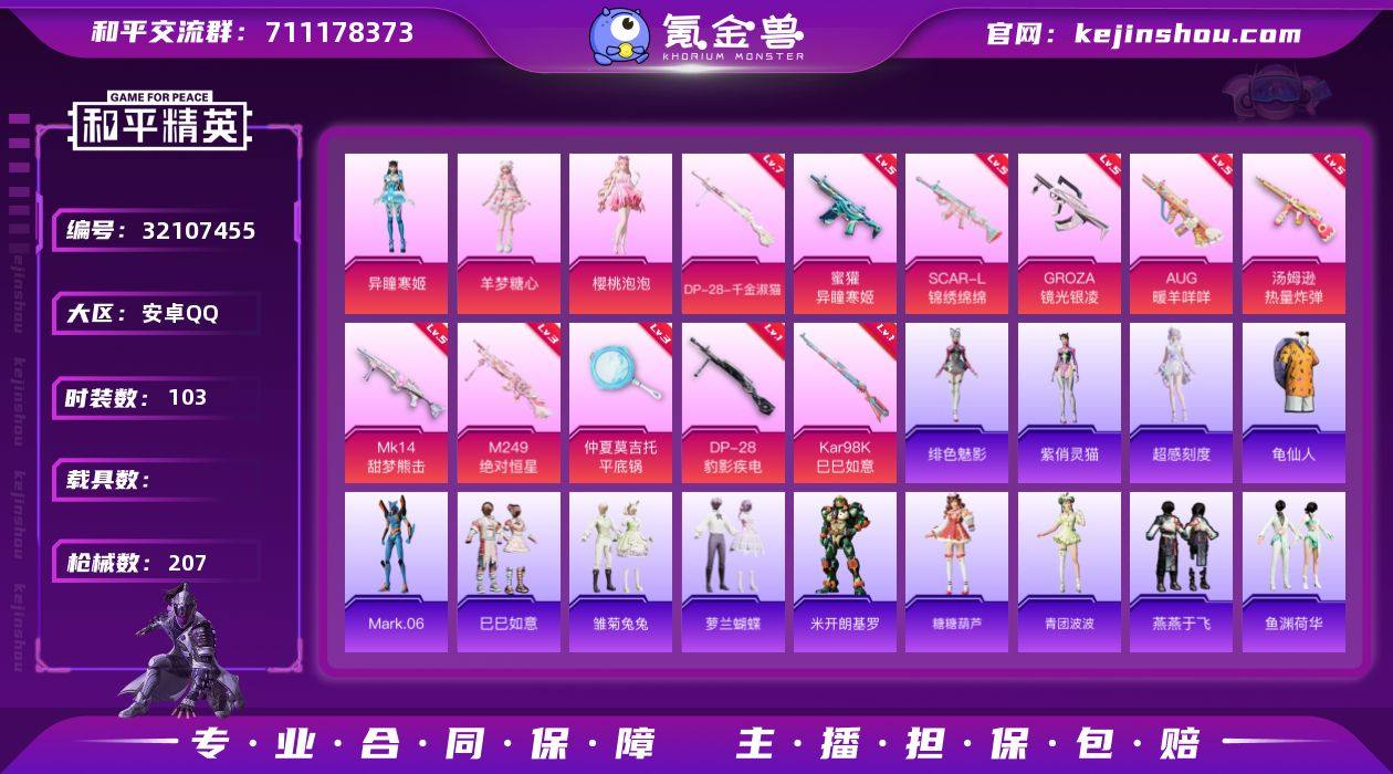 YZJ15307-可二次-安卓Q-3粉装12特效枪5热门102套装207枪皮 52264热力值 精品女号 地铁满天赋 储藏室4词条M338 羊梦糖心 樱桃泡泡 云朵鹅 快闪甜心 春光漫游 蓝螳螂 TT战队服 满级DP28千金淑猫 满级AUG暖羊 8印记 历史传奇王牌15星 【3粉装】 异瞳寒姬 樱桃泡泡 羊梦糖心 【12特效枪】 SCAR-L-锦绣绵绵 (5级) Kar98K-巳巳如意 (1级) DP-28-千金淑猫 (7级) DP-28-豹影疾电 (1级) AUG-暖羊咩咩 (5级) 蜜獾-异瞳寒姬 (5级) Mk14-甜梦熊击 (5级) GROZA-镜光银凌 (5级) 汤姆逊-热量炸弹 (5级) M249-绝对恒星 (3级) Mk14-福马献瑞 (4级) 平底锅-仲夏莫吉托 (3级) 【5热门】 Mark.06 龟仙人 TT战队服 漫步者 破蛋小黄鸡 营地ID:951557415