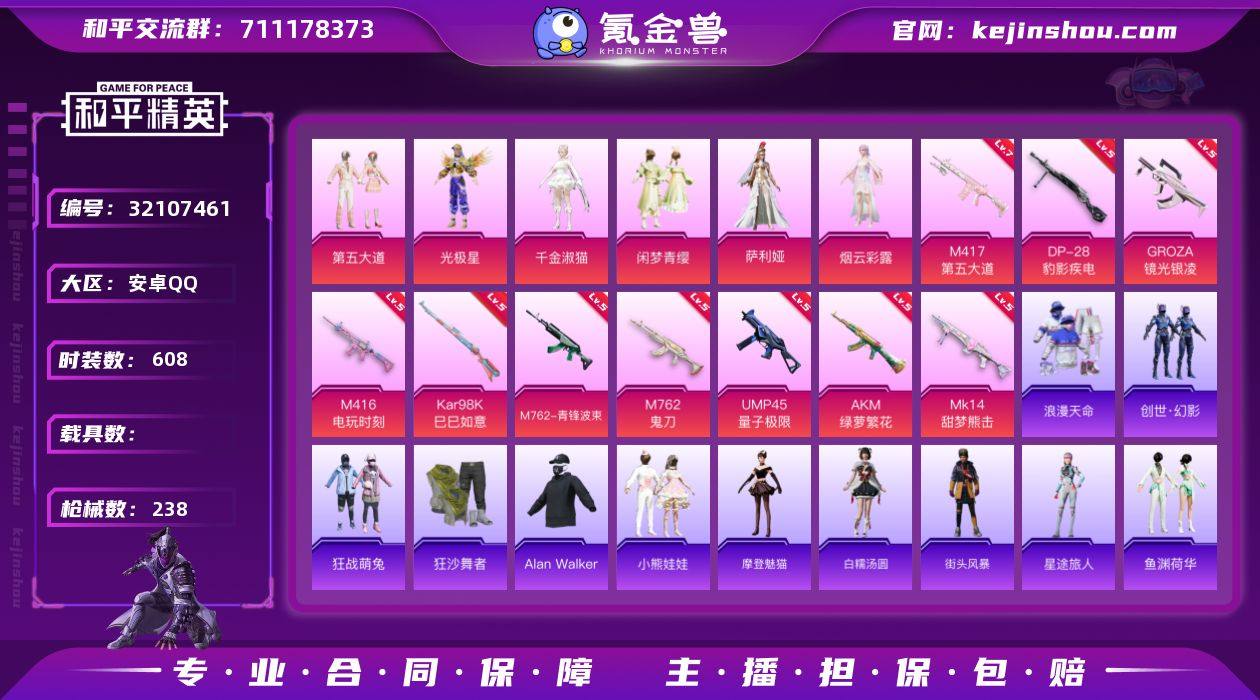 【特价出售】安卓Q-2稀有6粉装10特效枪7热门160套装238枪皮 71006热力值 10印记 历史传奇王牌14星 【2稀有】 AWM-黄金龙骨 浪漫天命 【6粉装】 萨利娅 光极星 千金淑猫 烟云彩露 闲梦青缨 第五大道 【10特效枪】 M416-电玩时刻 (5级) AKM-绿萝繁花 (5级) Kar98K-巳巳如意 (5级) M762-鬼刀 (5级) M762-青锋波束 (5级) DP-28-豹影疾电 (5级) UMP45-量子极限 (5级) Mk14-甜梦熊击 (5级) GROZA-镜光银凌 (5级) M417-第五大道 (7级) 【7热门】 Mark.06 龟仙人 鹰眼刺客 忍者信条 狂沙舞者 漫步者 破蛋小黄鸡 【3头盔】 百万伏特头盔 幻影战神头盔 金羽特工头盔 【1背包】 金羽特工背包