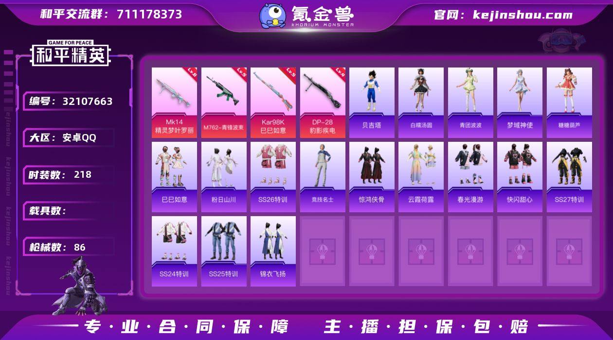 【特价出售】钱包无法注销安卓Q-4特效枪1热门55套装86枪皮 25308热力值 历史荣耀皇冠Ⅲ 【4特效枪】 Kar98K-巳巳如意 (5级) M762-青锋波束 (5级) DP-28-豹影疾电 (4级) Mk14-精灵梦叶罗丽 (6级) 【1热门】 龟仙人