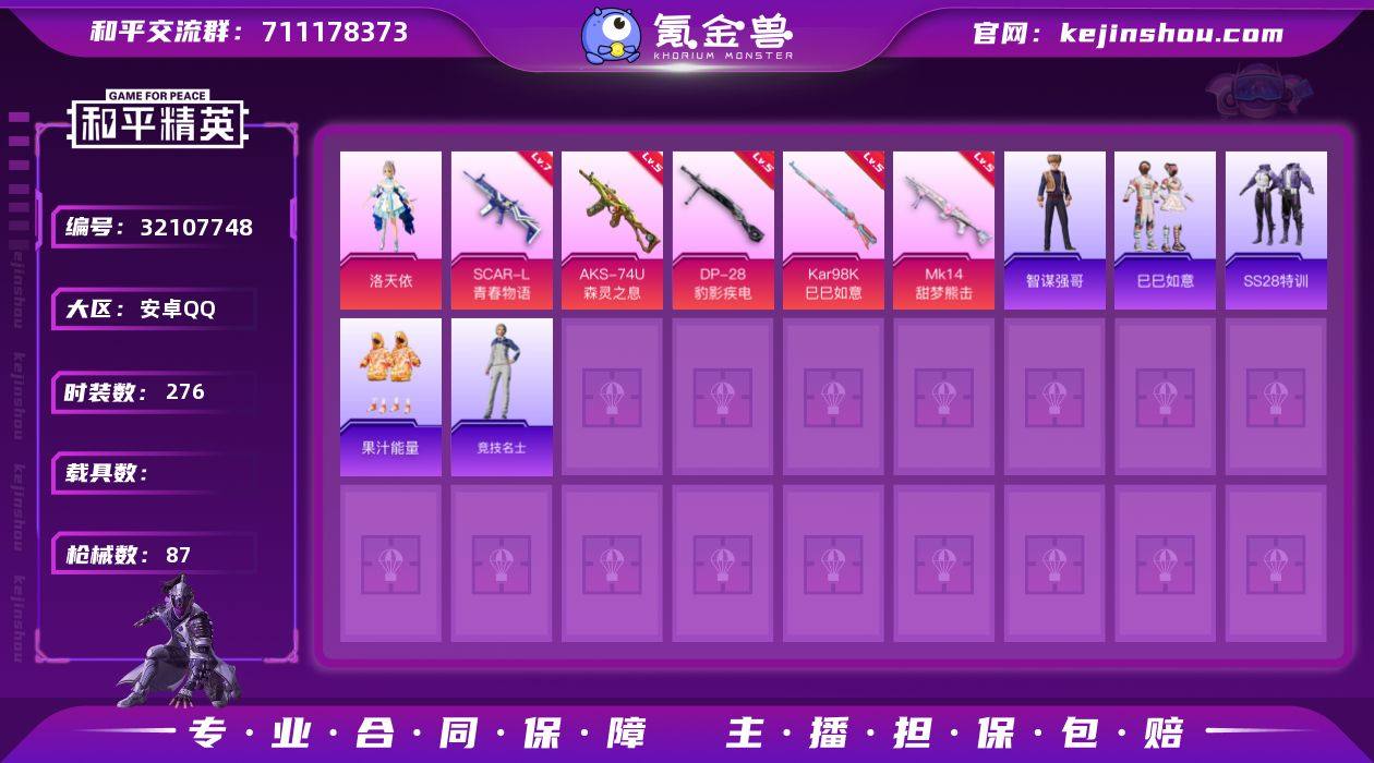 【特价出售】安卓Q-1粉装5特效枪2热门65套装87枪皮 25054热力值 5印记 历史传奇王牌13星 【1粉装】 洛天依 【5特效枪】 AKS-74U-森灵之息 (5级) Kar98K-巳巳如意 (5级) DP-28-豹影疾电 (5级) Mk14-甜梦熊击 (5级) SCAR-L-青春物语 (7级) 【2热门】 Mark.06 军刀雅典娜 【1背包】 深海小丑鱼背包