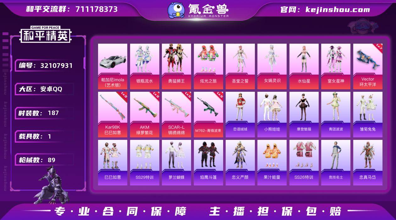 【特价出售】安卓Q-1载具7粉装5特效枪2热门52套装89枪皮 28240热力值 4印记 历史超级王牌2星 【1载具】 帕加尼imola(艺术银) 【7粉装】 圣堂之誓 女娲灵识 水仙星 炫光之旅 室女星神 勇猛狮王 银瓶流水 【5特效枪】 SCAR-L-锦绣绵绵 (5级) AKM-绿萝繁花 (5级) Kar98K-巳巳如意 (5级) M762-青锋波束 (5级) Vector-环太平洋 (7级) 【2热门】 激萌罗小黑 英勇保护者