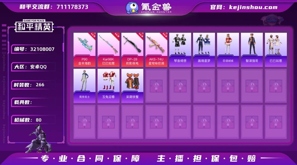 安卓 手Q-1粉装-4特效枪-0载具-1粉色飞行器-32640热力值-4王牌印记-88套装-109枪皮【粉色套装】:粉装-幻彩电音【粉色枪皮等级】:AKS-74U-星穹咏叹调(七级),Kar98K-巳巳如意(五级),Mk14-福马献瑞(五级),DP-28-豹影疾电(五级)【粉色枪皮】:AKS-74U-星穹咏叹调,Kar98K-巳巳如意,Mk14-福马献瑞,DP-28-豹影疾电【粉色飞行器】:炫彩糖果飞行器【粉色降落伞】:彩虹甜喵降落伞,江南烟雨降落伞,精灵梦叶罗丽降落伞,千金淑猫降落伞,月影灵韵降落伞,异瞳寒姬降落伞,炫彩糖果降落伞【稀有套装】:套装-摩登天骄,套装-绒宝小鹅,套装-巳巳如意,套装-雪国风尚,套装-马上来财,套装-雏菊兔兔,套装-萝兰蝴蝶,套装-糖糖葫芦,套装-青团波波,角色-光矢逐梦,套装-燕燕于飞,套装-鱼渊荷华,套装-云朵鹅,套装-雪绒豹,角色-幽雨猫猫【稀有枪皮】:AKM-彩虹符号,AKM-缤纷海域,SCAR-L-红色方程式,M416-糯团青竹,M416-红色方程式,M416-蓝色火焰,AUG-耀粉歌者,AUG-月影灵韵,QBZ-彩虹符号,M762-天降萌叽,M762-云朵鹅,AC-VAL-天降萌叽,AC-VAL-彩虹甜喵,蜜獾-天降萌叽,蜜獾-娇憨猪猪,UZI-天降萌叽,UZI-娇憨猪猪,UZI-月影灵韵,UMP45-生命誓言,UMP45-蓝色火焰,UMP45-绒宝小鹅,Vector-焰鹰斗篷,汤姆逊-耀粉歌者,P90-巳巳如意,Kar98K-红色方程式,AWM-焰鹰斗篷,Mini14-炫彩节奏,SLR-娇憨猪猪,SLR-彩虹符号,SVD-云朵鹅,S686-生命誓言,S686-巳巳如意,S12K-音爆索尼克,S12K-娇憨猪猪,DBS-焰鹰斗篷,DBS-月影灵韵,SPAS-12-云朵鹅,DP-28-焰鹰斗篷,MG3-幻世战舞者,MG3-第五大道,R45-幻彩电音,沙漠之鹰-云朵鹅,大砍刀-云朵鹅,破片手榴弹-巳巳如意【其他套装】:套装-SS21特训,套装-SS22特训,套装-SS23特训,套装-SS24特训,套装-SS25特训,套装-SS27特训,套装-SS28特训,套装-SS29...