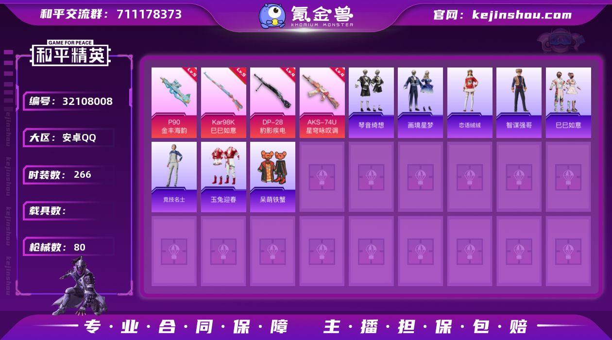 TD263711 安卓 手Q-2粉装-5特效枪-0载具-2粉色飞行器-38334热力值-2王牌印记-111套装-134枪皮 【热门品类】:套装-龟仙人 【粉色套装】:角色-天龙座 紫龙,粉装-星穹咏叹调 【粉色枪皮等级】:UMP45-萌骑冒险(四级),Kar98K-巳巳如意(五级),Mk14-福马献瑞(四级),DP-28-豹影疾电(五级),MG-36-沧焰双生(五级) 【粉色枪皮】:UMP45-萌骑冒险,Kar98K-巳巳如意,Mk14-福马献瑞,DP-28-豹影疾电,MG-36-沧焰双生 【粉色飞行器】:炫彩糖果飞行器,极意拳锋飞行器 【粉色降落伞】:怪笑疯兔降落伞,圣斗士星矢降落伞,星穹咏叹调降落伞,幻彩电音降落伞,无垠阁降落伞,异瞳寒姬降落伞,炫彩糖果降落伞 【稀有套装】:套装-龟仙人,套装-巳巳如意,套装-炫彩糖果,角色-幸运青,套装-马上有钱,套装-燕燕于飞,套装-鱼渊荷华,套装-镭金极速,角色-海琴烟,套装-紫幽梦,套装-蓝冰羽,套装-星渊小夜曲,玩偶服-懒羊羊 【稀有枪皮】:AKM-破晓战魂,AKM-龙的传人,M16A4-幻世战舞者,M16A4-红色方程式,M16A4-蓝色火焰,SCAR-L-夜灯,SCAR-L-炫彩节奏,SCAR-L-玉兔迎春,SCAR-L-红色方程式,M416-红色方程式,M416-蓝色火焰,GROZA-懵萌河马,AUG-耀粉歌者,AUG-黑白懵懵牛,QBZ-彩虹符号,M762-天降萌叽,M762-奇异狩猎者,G36C-懵萌河马,G36C-星穹咏叹调,AC-VAL-快闪甜心,蜜獾-千面幻镜,蜜獾-天降萌叽,UZI-啾咪啾咪,UZI-天降萌叽,UZI-红色方程式,UZI-月影灵韵,UMP45-夜灯,UMP45-生命誓言,UMP45-蓝色火焰,Vector-生命誓言,汤姆逊-天降萌叽,汤姆逊-耀粉歌者,AKS-74U-鬼刀,P90-快闪甜心,P90-巳巳如意,Kar98K-炫彩节奏,Kar98K-红色方程式,M24-炫彩节奏,SKS-糯团青竹,VSS-彩虹符号,Mini14-耀粉歌者,SLR-彩虹符号,莫辛纳甘-懵萌河马,M417-蓝晶绮麟,MK20-H-快闪甜心,MK20-H-净心行者,S686-红...