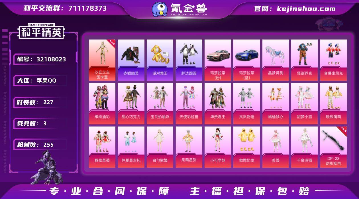 YZJ15145-可二次-苹果Q-1红装4稀有3载具19粉装11特效枪18热门【精氪公主号 可萌可身法 热门 萌妹 身法系列套装多多 粉玛 蓝玛 3级图卡盟 小丑 巧克力三姐妹 小狐 猪妹 赤蝎 金鞋 权威小番茄 浅蓝色牛仔外套 小可 白勺 呆萌 仲夏莫吉托 千金淑猫 暖熊萌萌 软软马卡龙 奶油梦幻熊 青涩年华 小黄鸭 胖达圆圆 浪漫波比 粉螳螂 白兰地假日 粉团憨憨 萌神柯基 萌兔 天命 白勺歌姬背包头盔 沙丘之主背包头盔 1级沙丘之主天马 1级龙翔九天飞行器 1级幽焰列车飞行器 11款飞行器 7张改名卡】227套装255枪皮 92830热力值 16印记 历史绝世王牌13星 【1红装】 沙丘之主-图卡盟 (3级) 【4稀有】 赤蝎幽灵 浪漫天命 派对舞王 派对舞王(金靴子) 【3载具】 玛莎拉蒂蓝色 玛莎拉蒂粉色 晶梦灵驹 【19粉装】 美雪 傲傲奶龙 宝贝奶油派 天使彩虹糖 甜心巧克力 千金淑猫 怪诞乔克 白勺歌姬 呆萌星弥 小可学妹 缤纷油彩 仲夏莫吉托 橘柚倾心 华贵君王 甜蜜草莓 暖熊萌萌 甜梦小狐 音爆索尼克 岚岚物语 【11特效枪】 M416-五爪金龙 (5级) SCAR-L-锦绣绵绵 (5级) M416-墨龙九天 (1级) AKM-白勺歌姬 (4级) Kar98K-巳巳如意 (5级) AWM-橘柚倾心 (2级) DP-28-豹影疾电 (5级) M416-暖熊萌萌 (4级) M417-第五大道 (4级) 平底锅-仲夏莫吉托 (1级) 烟雾弹-猫咪绅士 (5级) 【18热门】 8号机 奇迹天团 龟仙人 萌神柯基 红熊茄茄 青涩年华 仓鼠灰灰 雪山精英 潮萌小黄鸭 软软马卡龙 爱崽白熊 奇迹天团 浪漫波比 胖达圆圆 暗夜契约 纯白誓言 破蛋小黄鸡 黑色刀锋 【1飞行器】 龙翔九天飞行器 【6头盔】 童趣迷兔头盔 九霄头盔 雪国精灵头盔 甜心宝贝头盔 百万伏特头盔 心之恋语头盔 【3背包】 雪国精灵背包 甜心宝贝背包 心之恋语背包 营地ID:704305532