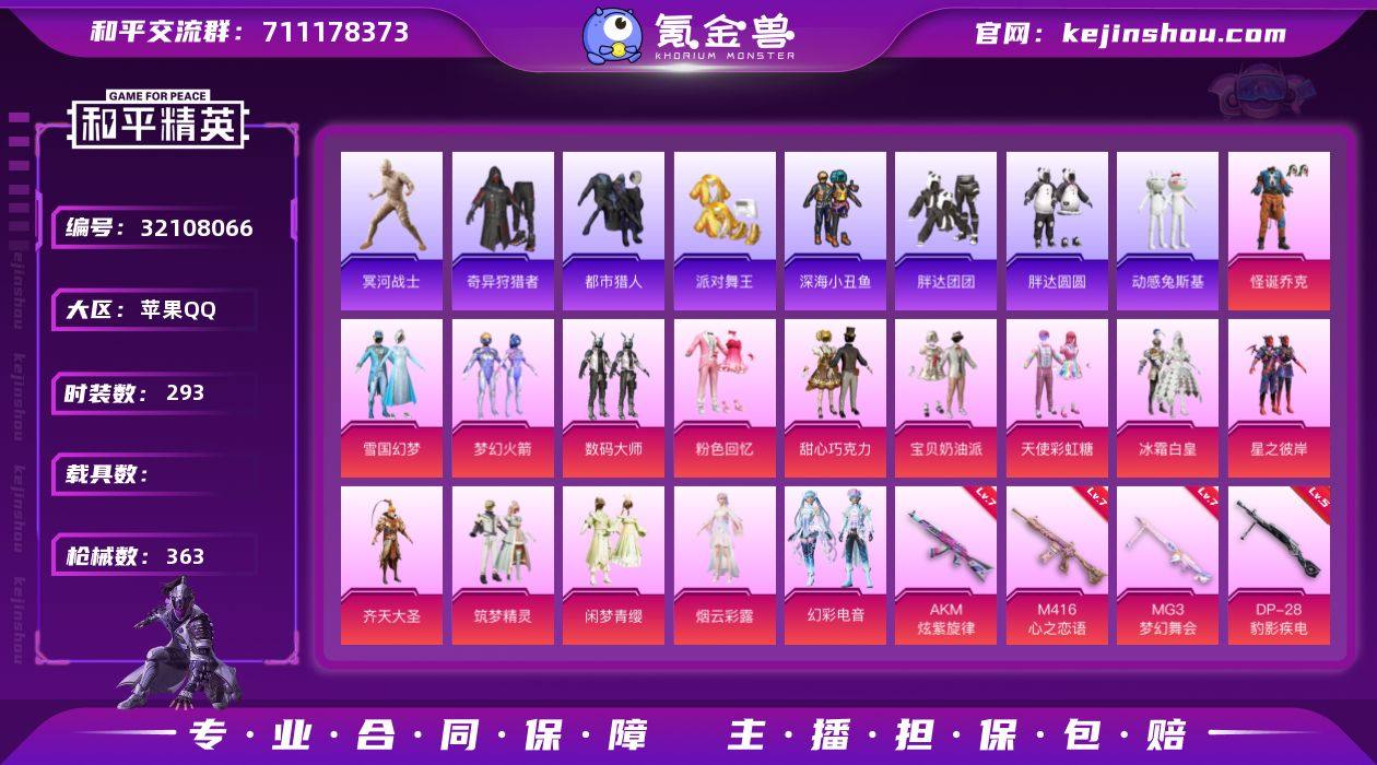 YZJ15411 可二次 苹果Q-8稀有15粉装16特效枪28热门293套装363枪皮 116464热力值 极品很乏素材号 地体满天赋 双字ID(前憊)皇冠Q 4词条AUG 4词条头盔 小丑 雪国 木乃伊 新火箭少女 巧克力三姐妹 齐天大圣 都市 金鞋 红眼罩 黑色ROCK长袖T恤 胖达圆圆 胖达团团 奇异狩猎者 小丑鱼 蓝螳螂 动感兔斯基 小狗蛇点点 爱崽白熊 兔兔白日梦 懒羊羊 NV战队服 国宝头盔 满级M4心之恋语 满级AK炫紫旋律 2级AUG星之彼岸 满级MG3梦幻舞会 20印记 历史卓越王牌17星 【8稀有】 木乃伊 奇异狩猎者 AKM-缤纷海域 SCAR-L-粉色回忆 都市猎人 浪漫天命 派对舞王 派对舞王(金靴子) 【15粉装】 梦幻火箭 雪国幻梦 宝贝奶油派 天使彩虹糖 甜心巧克力 烟云彩露 怪诞乔克 闲梦青缨 幻彩电音 筑梦精灵 粉色回忆 数码大师 冰霜白皇 星之彼岸 齐天大圣 【15特效枪】 SCAR-L-锦绣绵绵 (5级) M416-心之恋语 (7级) AKM-炫紫旋律 (7级) AKM-绿萝繁花 (5级) Kar98K-巳巳如意 (5级) DP-28-豹影疾电 (5级) AUG-暖羊咩咩 (5级) UMP45-量子极限 (5级) GROZA-镜光银凌 (5级) AUG-星之彼岸 (2级) MG3-梦幻舞会 (7级) AKS-74U-森灵之息 (2级) Mk14-福马献瑞 (5级) AA12-G-萌骑幻想 (5级) ACE32-萌骑漫游 (3级) 【28热门】 Mark.06 小丑鱼 龟仙人 浪漫假日 动感兔斯基 小狗蛇点点 爱崽白熊 呆萌铁蟹 兔兔白日梦 迅捷狂鲨 深海小丑鱼 大橘为重 胖达圆圆 胖达团团 NV战队服 暗影哥特 团圆交子 瑞龙福将 水银刺客 狂沙舞者 漫步者 破蛋小黄鸡 弄潮海豚 AKM-奇异狩猎者 M762-奇异狩猎者 M762-瑞龙福将 M24-奇异狩猎者 S686-奇异狩猎者 【2飞行器】 梦幻火箭飞行器 萌物绒绒飞行器 【7头盔】 国宝胖达头盔 梦幻火箭头盔 雪国精灵头盔 甜心宝贝头盔 幻影战神头盔 深海小丑鱼头盔 金羽特工头盔 【6背包】 雪国精灵背包 甜心宝贝背包 幻影战神背包 深海小丑鱼背包...