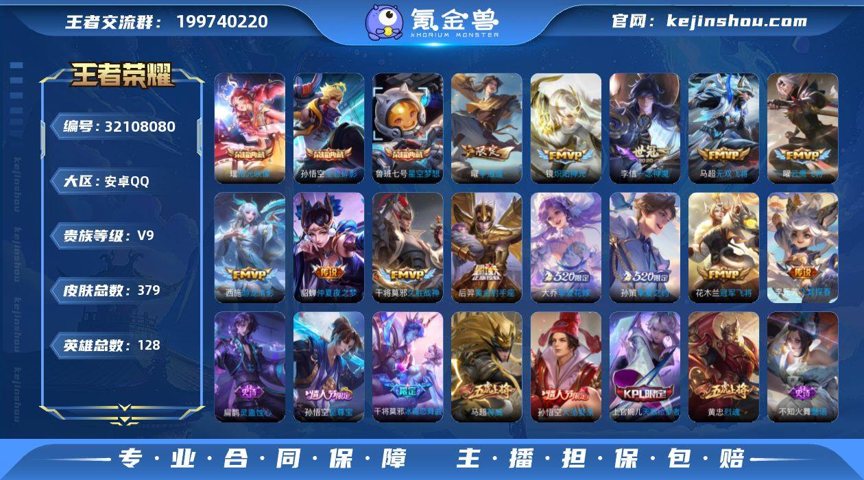 V9 3典藏 19传说 128英雄 379皮肤 可修改实名 女号 【英雄全皮】孙权全皮,蚩奼全皮,鬼谷子全皮,鲁班大师全皮,影全皮,大禹全皮 【稀有英雄】敖隐(小龙人),大司命,嬴政(始皇帝),韩信(韩跳跳),夏洛特(夏师傅),艾琳,橘右京(橘子),娜可露露(鸟人),不知火舞,赵云,金蝉(唐僧),戈娅 【荣耀水晶】拾光映像(瑶典藏),全息碎影(猴子典藏),星空梦想(太空人) 【传说皮】神树通天,李逍遥,游龙清影(小青龙),黄金射手座,仲夏夜之梦(大飞蛾),一念神魔,冠军飞将,久胜战神,云鹰飞将(小将军),炽阳神光,无双飞将,飞鸢探春,超时空战士-狄仁杰,挚爱之约,挚爱花嫁 【珍宝阁皮】妄想食味,万物之道,优雅恋人,女武神 【赛季/战令皮】噬灭天穹(s37),古海寻踪(s33),海盐诗旅(s30),擒涛扼浪(s31),探海日志(s32),顽趣-梦奇,地狱燃心,剑破天穹(s35),天穹祈灯(s34),天穹之誓(s36),蜃楼王(s4),妖精王(s5),炼金王(s6),凯尔特女王(s7),狰(s8),饕餮(s9),烛龙(s10),重明(s11),穷奇(s12),御狮(s13),御霄(s14),御旌(s15),御銮(s16),朔风刀(s17),混沌棋(s18),疑决卦(s19),醍醐杖(s20),原初探秘者(s21),万华元夜(s22),演武夺筹(s23),驱傩正仪(s24),千军破阵(s25),猎兽之王,白昼王子,朔望之晖,蓝屏警告,神迹守卫-钟馗,狮舞东方,赤莲之焰,夺宝奇兵,迷踪丽影,西部大镖客-猪八戒,暗影游猎(游乐娃子),单词大作战,狂想玩偶喵,潮玩骑士王,云间偶戏,神迹守卫-墨子,航海奇遇记,圣弓游侠,真爱魔法,火炮绅士,沙漠行僧(s26),幻夜卜梦,吟游魔法,夜都怪侠,金庭之子(s27),电玩高手(电玩铁子),午后时光,大漠名商(s28),云中旅人(s29),超时空战士-钟无艳,落雪兰心 【史诗皮】线条小狗-周瑜,巫礼祀神,万灵启世,光弋星穹,罗小黑战记-百里玄策,灵蛊蚀心,百相守梦-黄忠,紫霞仙子,苍穹之光,电玩小子(小