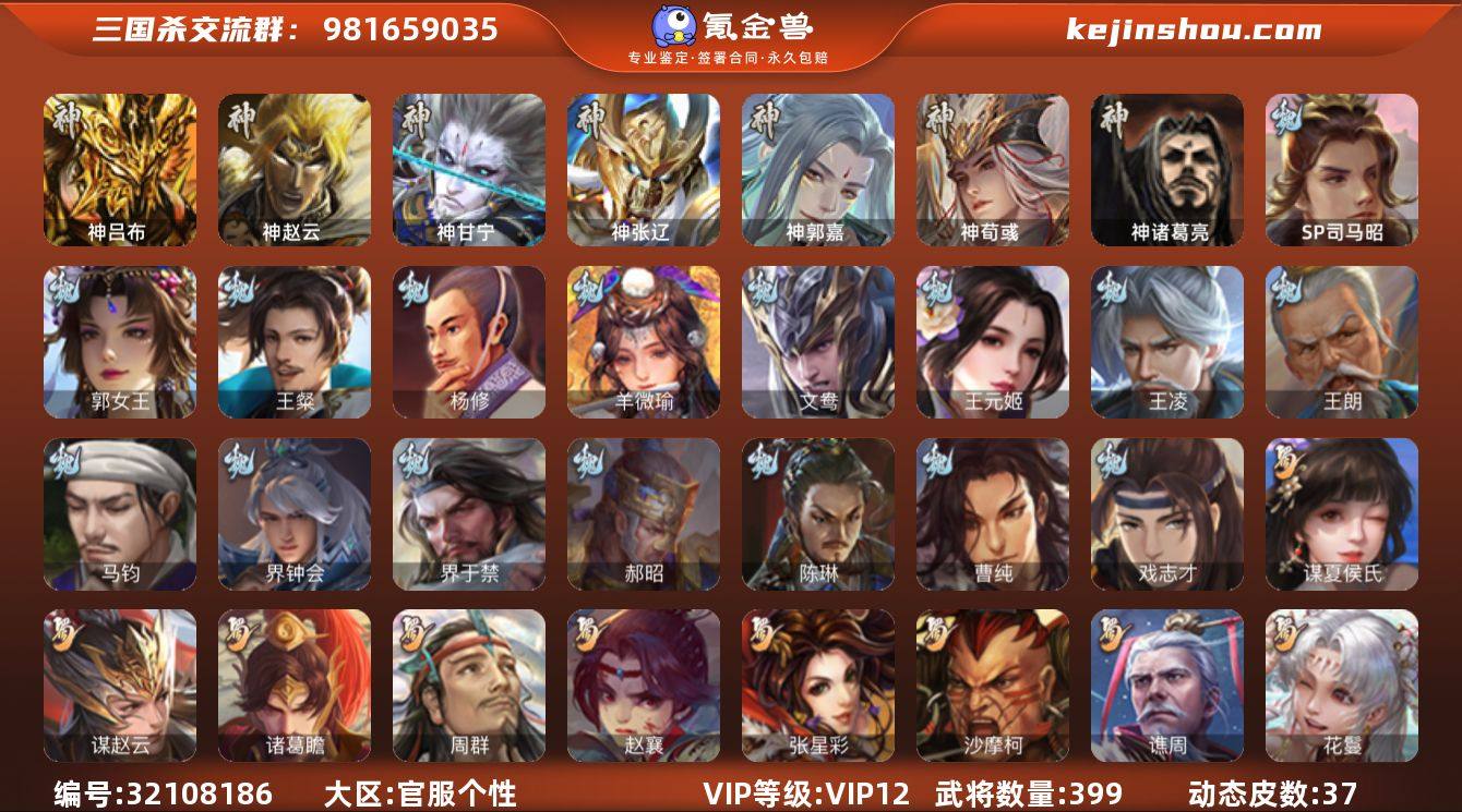 【1698】官阶:大将军;VIP等级:VIP12;史诗武将数量:61;动态皮肤数量:37;武将总数:399;史诗宝珠数量:0;将魂数量:5179;神将:9;魏国史诗武将:25;蜀国史诗武将:12;吴国史诗武将:8;群史诗武将:18 神吕布,神赵云,神甘宁,神张辽,神郭嘉,神荀彧,神吕蒙,神周瑜,神诸葛亮,SP司马昭,郭女王,王粲,杨修,羊徽瑜,文鸯,王元姬,王凌,王朗,马钧,界钟会,界于禁,郝昭,陈琳,曹纯,戏志才,关索,谋夏侯氏,谋赵云,诸葛瞻,周群,赵襄,张星彩,沙摩柯,谯周,花鬘,董允,鲍三娘,张奋,周处,吴景,骆统,留赞,界朱然,界徐盛,贺齐,左慈,张仲景,张让,杨彪,星黄忠,星甘宁,苏飞,麹义,祢衡,刘焉,沮授,界左慈,界李儒,公孙康,杜预,张绣,李傕,许攸,神郭嘉-虎年清明(动态),神荀彧-虎年清明(动态),神甘宁-万人辟易(动态),神诸葛亮-风舞魔鸟(动态),神曹操-天下归心,神赵云-战龙在野(动态),鲍三娘-情定缘起,曹丕-气荡山河(动态),星周不疑-龙年清明(动态),SP蔡文姬-兔年冬日(动态),许褚-虎啸生风(动态),司马懿-牛年立冬(动态),界司马懿-牛年立冬(动态),界许褚-虎啸生风(动态),曹昂-竭战麟伤(动态),戏志才-举棋若定(动态),朱灵-以战破氐(动态),曹纯-虎年春节(动态),王元姬-鼠年冬至(动态),羊徽瑜-牛年中秋(动态),刘备-龙御天下(动态),诸葛亮-龙年限定(动态),刘备-明良千古(动态),黄月英-明良千古(动态),诸葛亮-明良千古(动态),诸葛瞻-绵竹之殇(动态),界刘备-明良千古(动态),界诸葛亮-明良千古(动态),界黄月英-明良千古(动态),SP孙尚香-明良千古(动态),关索-鼠年中秋(动态),鲍三娘-虎年七夕(动态),周处-义除三害(动态),孙权-永开吴祚(动态),周瑜-兔年七夕(动态),孙策-虎踞江东(动态),孙权-猪年端午(动态),界孙权-猪年端午(动态),徐盛-破军杀将(动态),徐氏-琪花瑶草(动态),孙鲁育-牛年端午(动态),孙茹-烟水悠悠(动态),周瑜-蛇年端午(动态),袁绍-声震寰宇(动...