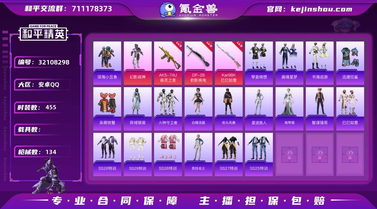 安卓 手Q-3粉装-3特效枪-0载具-1粉色飞行器-44242热力值-1王牌印记-133套装-162枪皮 【热门品类】:套装-龟仙人 【粉色套装】:角色-萨利娅,角色-天鹅座 冰河,角色-绯穹魔姬 【粉色枪皮等级】:Kar98K-巳巳如意(五级),DP-28-豹影疾电(五级),PKM-江南烟雨(七级) 【粉色枪皮】:Kar98K-巳巳如意,DP-28-豹影疾电,PKM-江南烟雨 【粉色降落伞】:环太平洋降落伞,音爆索尼克降落伞,绝色倾城降落伞,精灵梦叶罗丽降落伞,炫彩糖果降落伞 【稀有套装】:套装-龟仙人,套装-巳巳如意,套装-炫彩糖果,角色-摩登魅猫,套装-燕燕于飞,套装-鱼渊荷华,角色-蜜桃派对,套装-紫幽梦,套装-蓝冰羽,套装-霓虹热舞,套装-朱霞炽焰,套装-凌霄紫焰,玩偶服-喜羊羊 【稀有枪皮】:AKM-彩虹符号,AKM-破晓战魂,AKM-霓虹街区,AKM-龙的传人,M16A4-幻世战舞者,M16A4-红色方程式,M16A4-蓝色火焰,SCAR-L-夜灯,SCAR-L-炫彩节奏,SCAR-L-玉兔迎春,SCAR-L-红色方程式,M416-糯团青竹,M416-红色方程式,M416-蓝色火焰,GROZA-彩虹符号,AUG-天降萌叽,AUG-耀粉歌者,M762-天降萌叽,M762-彩虹符号,M762-牛气冲天,G36C-星穹咏叹调,AC-VAL-天降萌叽,AC-VAL-快闪甜心,蜜獾-天降萌叽,蜜獾-娇憨猪猪,ARX-凌霄紫焰,UZI-啾咪啾咪,UZI-天降萌叽,UZI-娇憨猪猪,UZI-炫彩节奏,UZI-红色方程式,UMP45-夜灯,UMP45-涂山之恋,UMP45-生命誓言,UMP45-蓝色火焰,UMP45-极意拳锋,Vector-焰鹰斗篷,Vector-彩虹符号,Vector-生命誓言,汤姆逊-天降萌叽,汤姆逊-炫彩节奏,汤姆逊-环太平洋,汤姆逊-耀粉歌者,汤姆逊-樱桃泡泡,JS9-凌霄紫焰,P90-快闪甜心,P90-巳巳如意,Kar98K-彩虹符号,Kar98K-红色方程式,M24-炫彩节奏,AWM-焰鹰斗篷,SKS-糯团青竹,VSS-彩虹符号,Mini14-涂山之恋,Mini14-耀粉歌者,SLR-娇憨猪猪,SLR-彩...